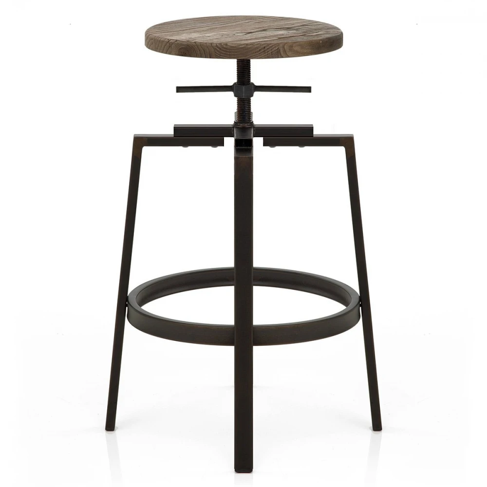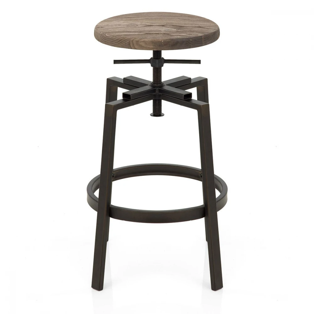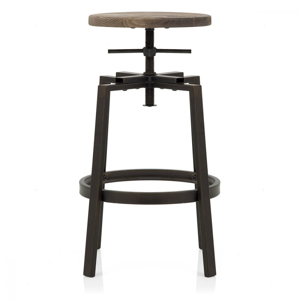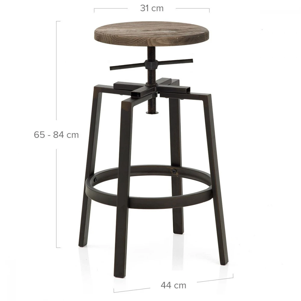 Der Holzbarhocker Turner Industrial verfügt über ein einzigartiges Vintage Design. Er ist der perfekte Statement Barhocker für das extravagante Heim und verfügt über einen Sitz aus dunklem Holz mit antikem Lack. Der Sitz ruht auf einem Schraubenmechanismus, mit dem man die Höhe flexibel verstellen kann. Der schicke Rahmen ist im authentischen und angesagten Industrial-Design gefertigt. Ihre Füße können Sie bequem auf der kreisrunden Fußstütze ablegen und natürlich verfügt der Turner Barhocker auch über Bodenschutzkappen.