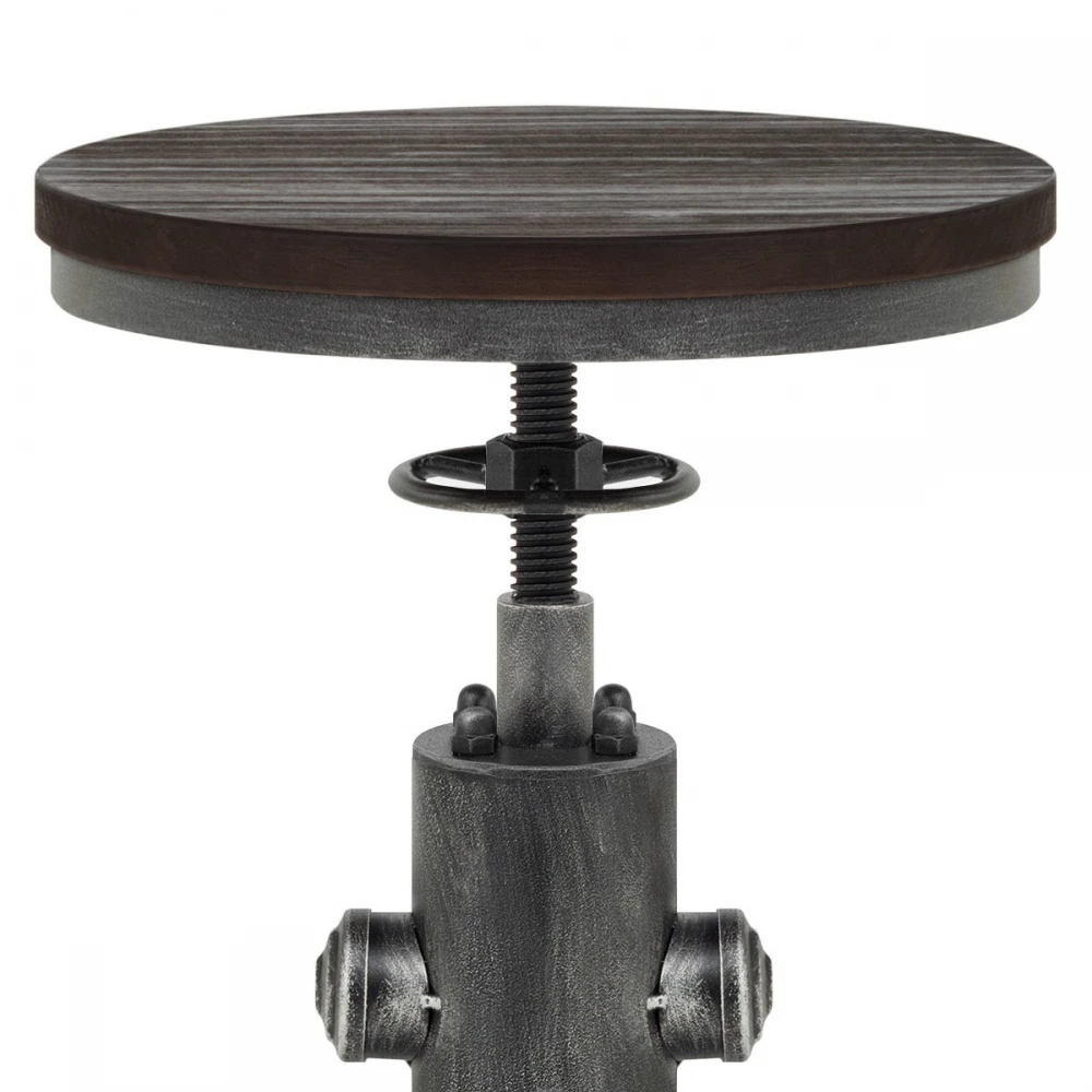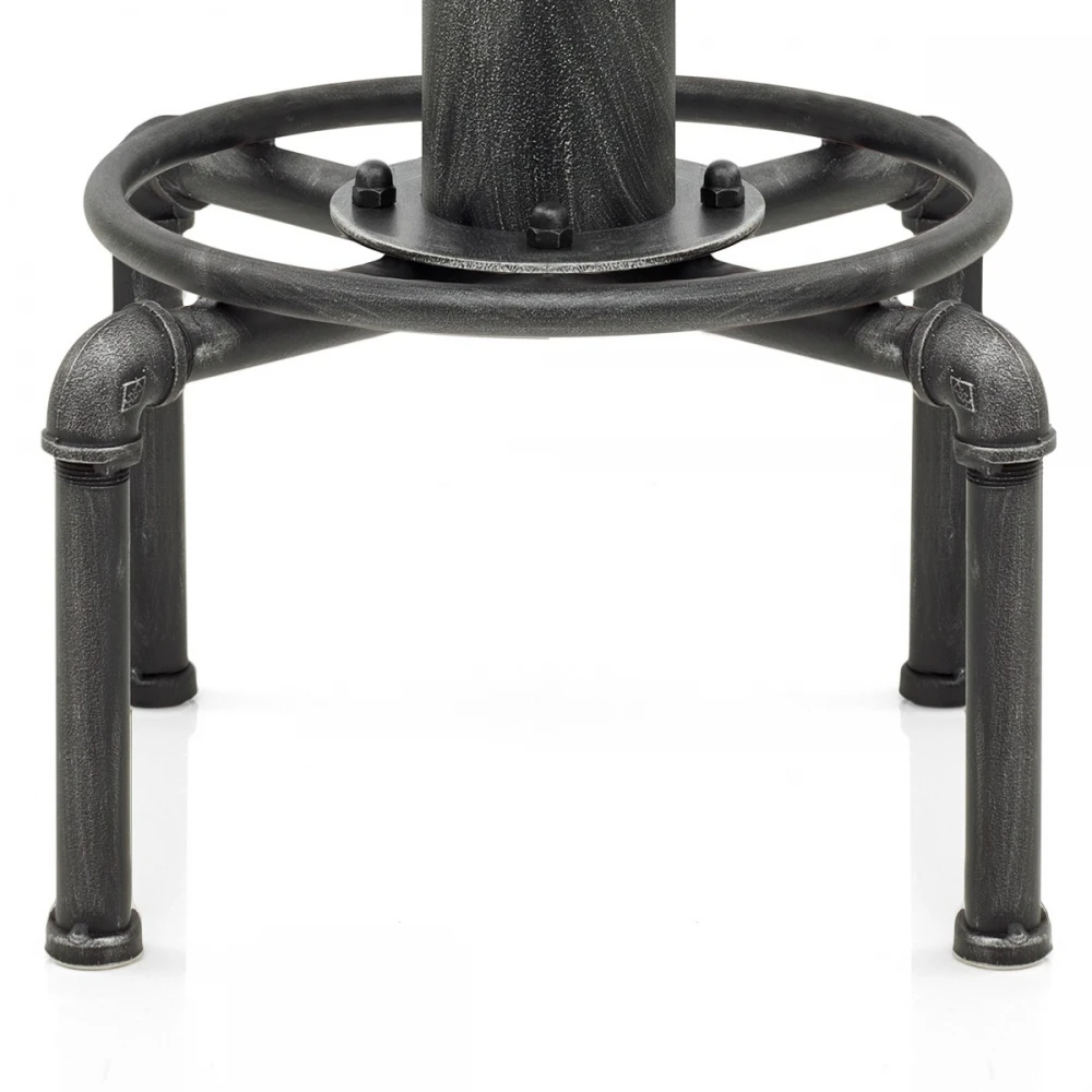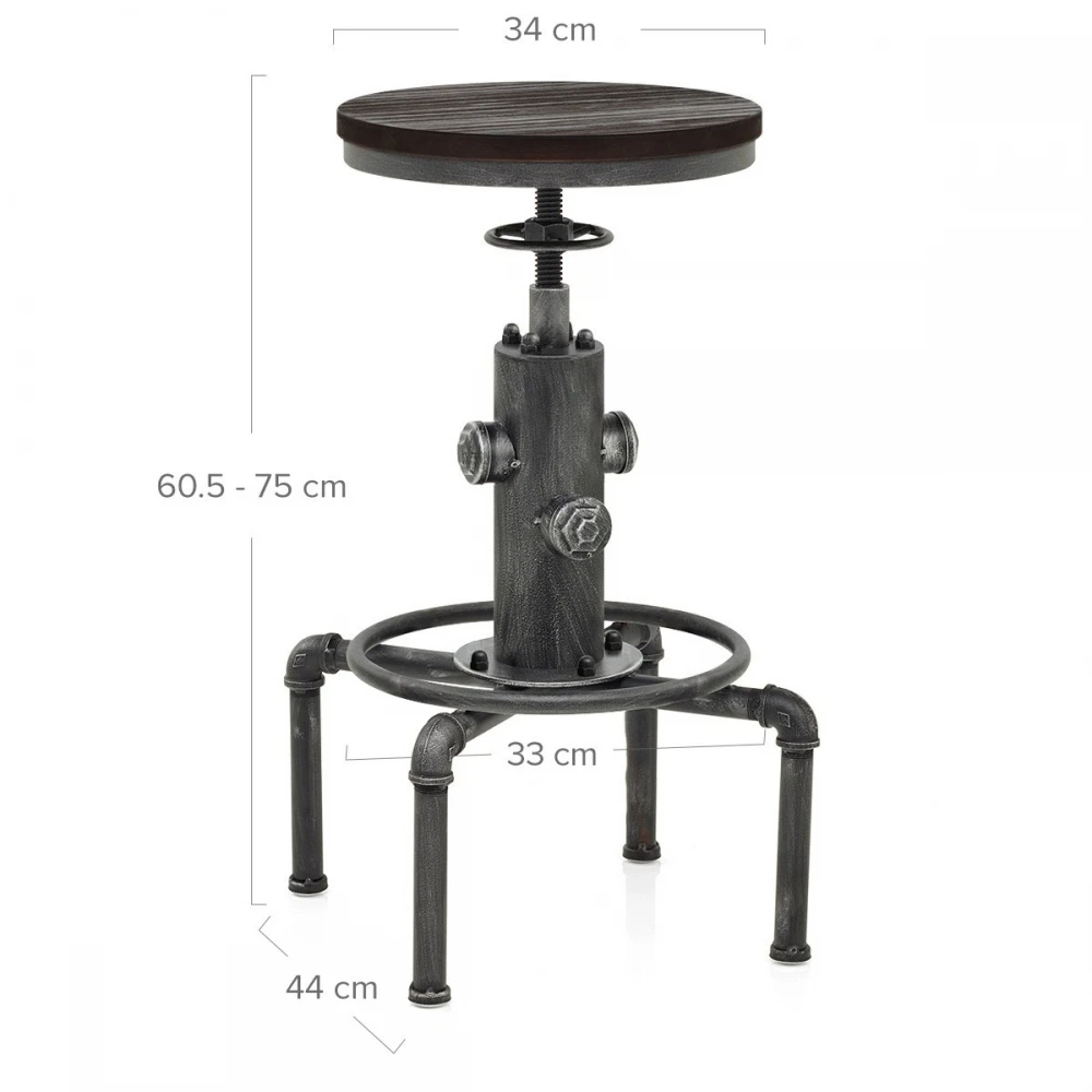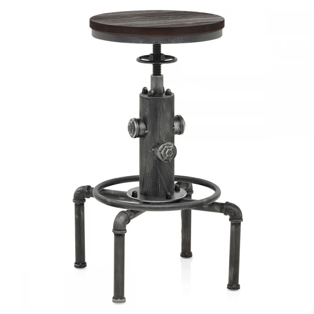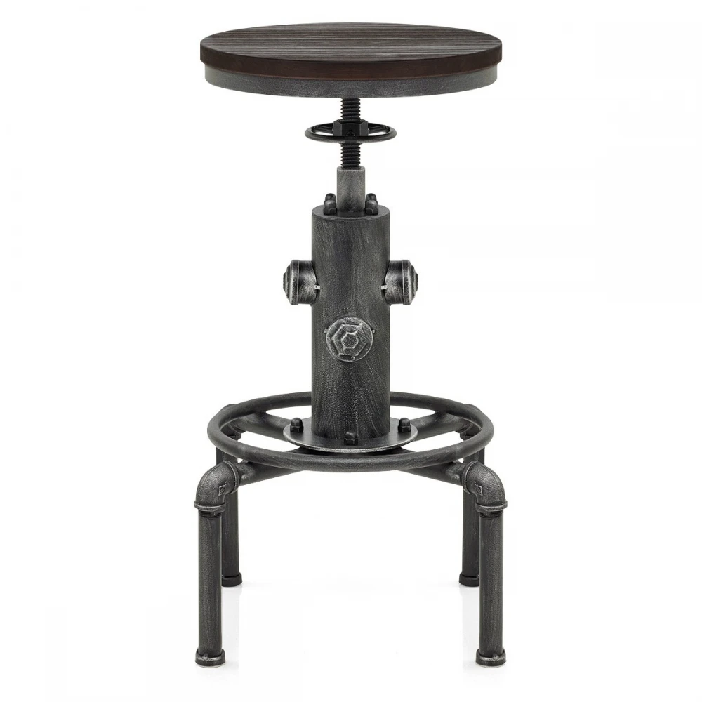 Der kompakte Barhocker im klassischen Industrie Design, ohne Rückenlehne, verfügt über einen stabilen dunklen Holzsitz, der jedem Ambiente Wärme verleihen wird. Angebracht auf einem metallisch-grauen Metallrahmen, kann die Sitzhöhe dank einem Schraubenmechanismus sehr einfach verstellt werden. Duch ein Drehmechanismus ist ebenfalls eine Drehung um 360 Grad möglich. Für zusätzlichen Komfort ist eine runde Fußstütze integriert. Die Füße sind außerdem mit Schützern für Ihren Boden versehen.