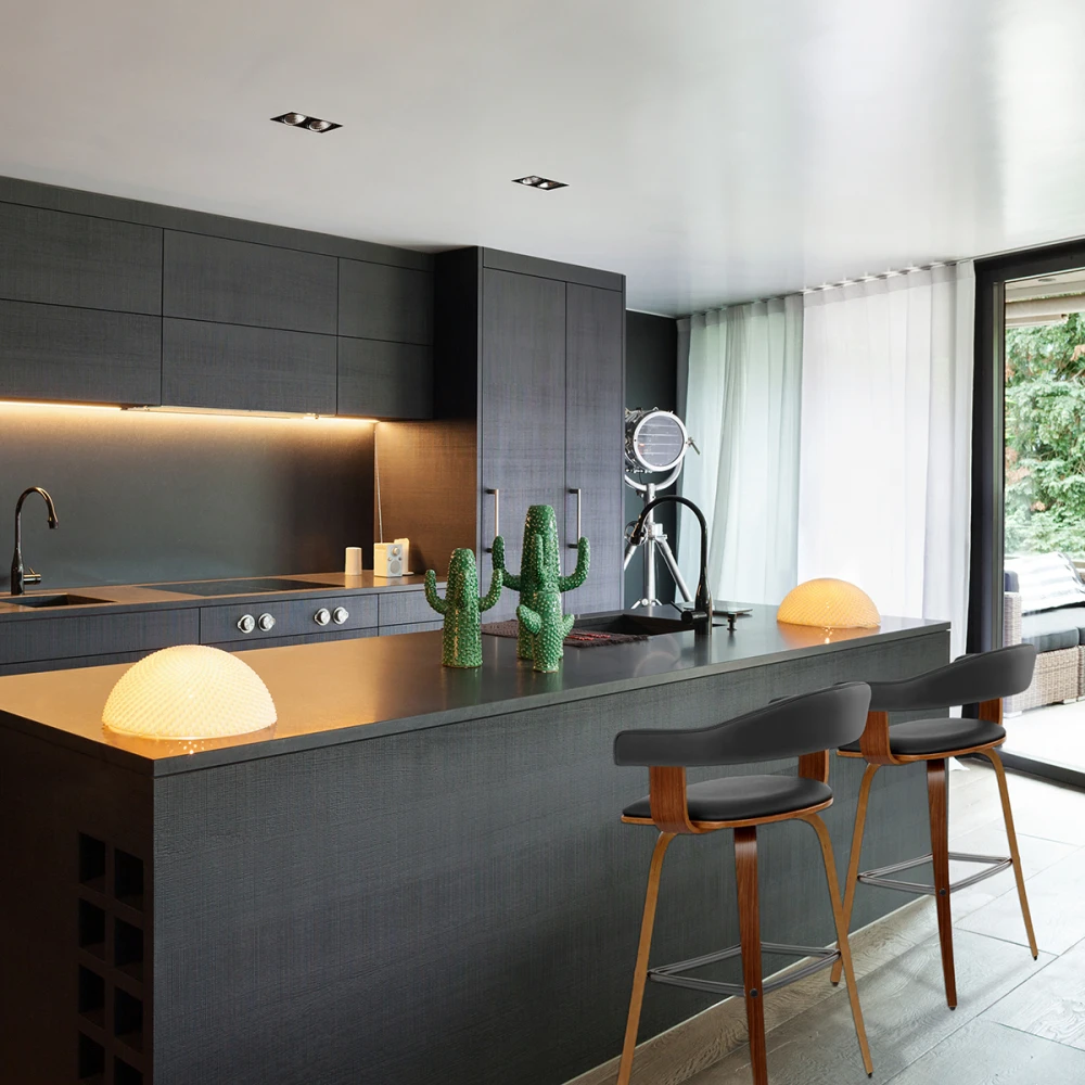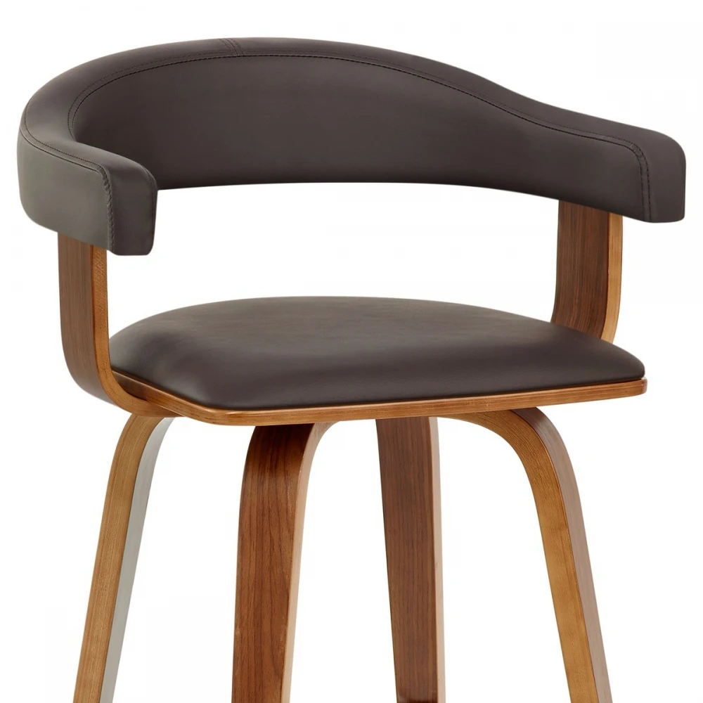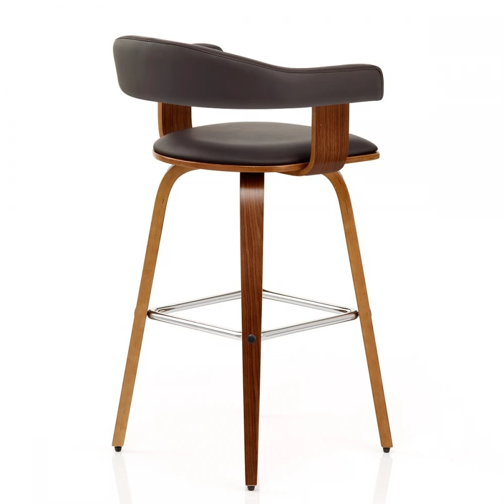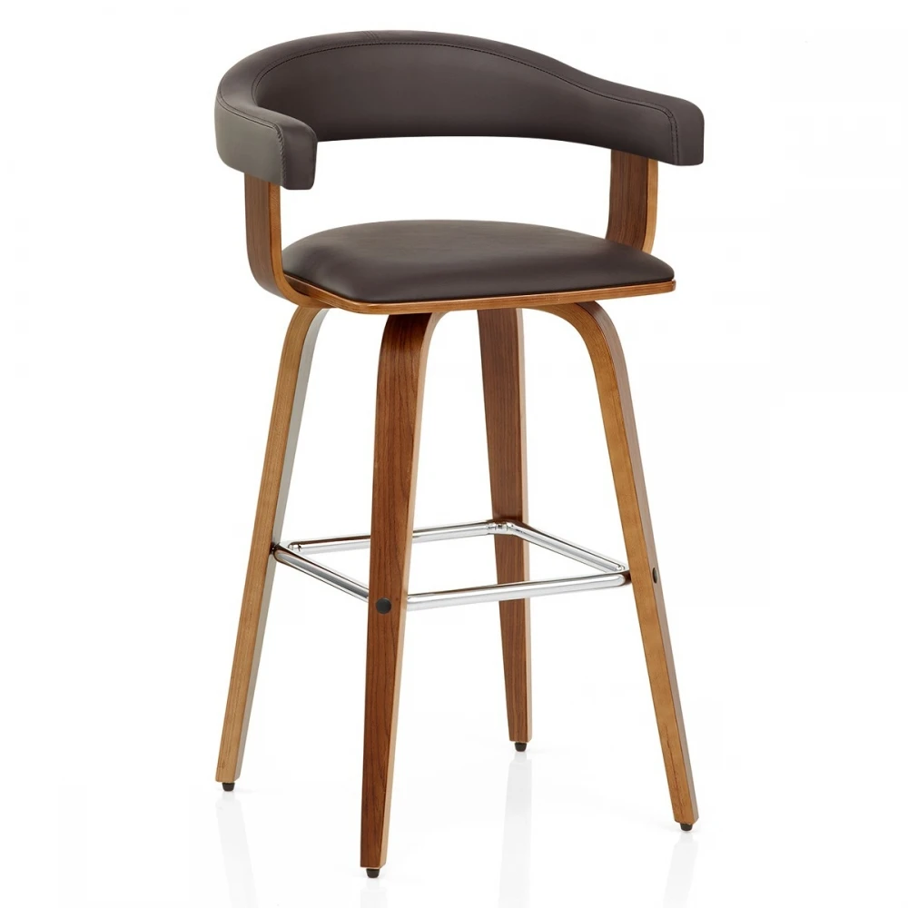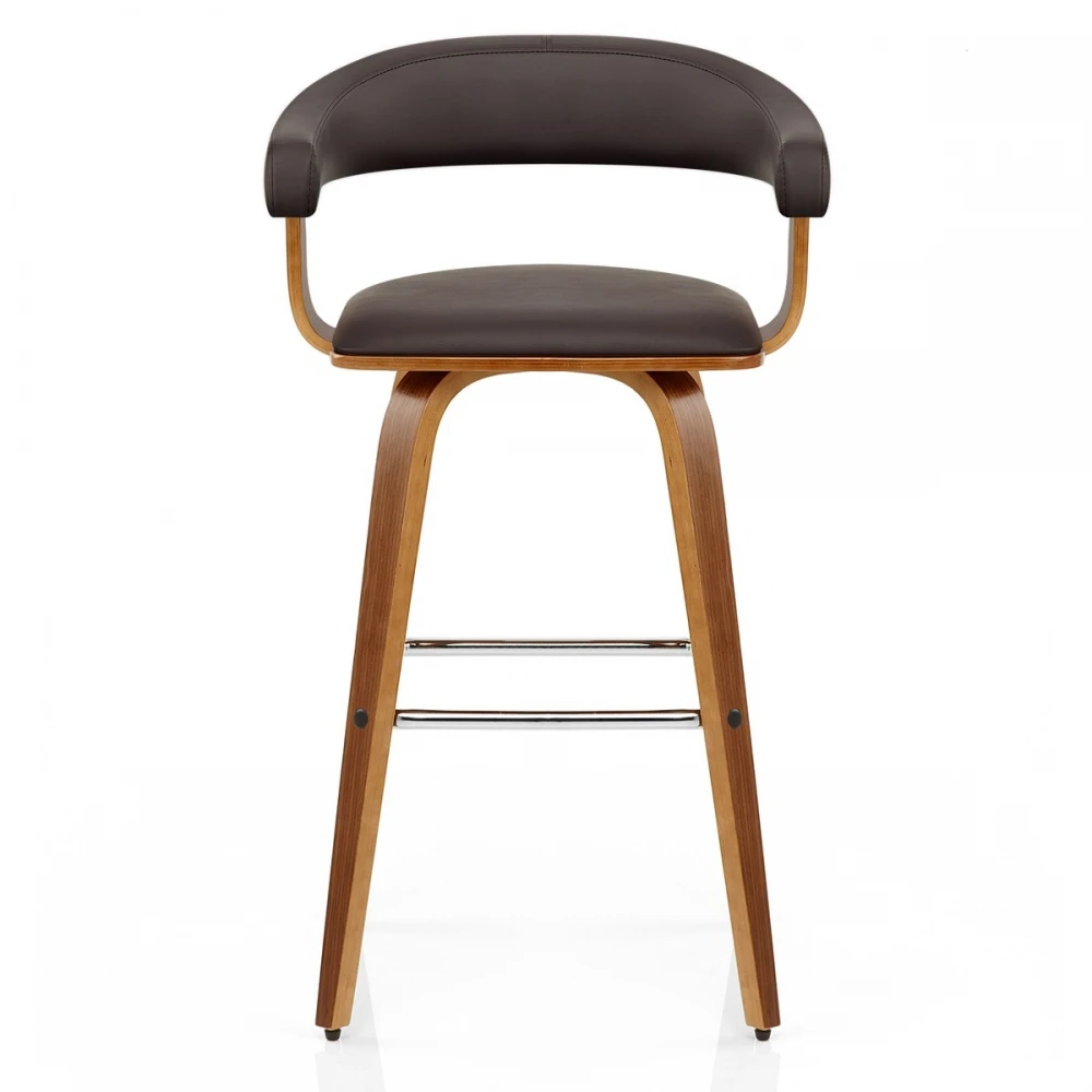 Bei dem Barhocker Walnuss Ontario handelt es sich um ein modisches Design, das eine traditionelle Walnusslackierung mit einem modernen, kurvigen Rahmen erfolgreich verschmelzen lässt. Der Sitz und die Rückenlehne sind mit schickem Kunstleder überzogen und werden Ihrer Küchenbar Luxus verleihen. Auf diesem Barhocker werden Sie sicher auch sehr viele geruhsame und gemütliche Stunden verbringen, denn der Sitz und die Rückenlehne sind gepolstert. Die schönen und stabilen Bugholzbeine sind durch quadratisch zulaufende Chromstäbe miteinander verbunden. Dieses modisch interessante Detail dient auch als praktische Fußstütze, auf der Sie ihre Füße ablegen können. Der Barhocker Walnuss Ontario ist ein verlässliches und zugleich schickes Möbelstück, dass durch Bodenschutzkappen an den Beinunterseiten abgerundet wird.