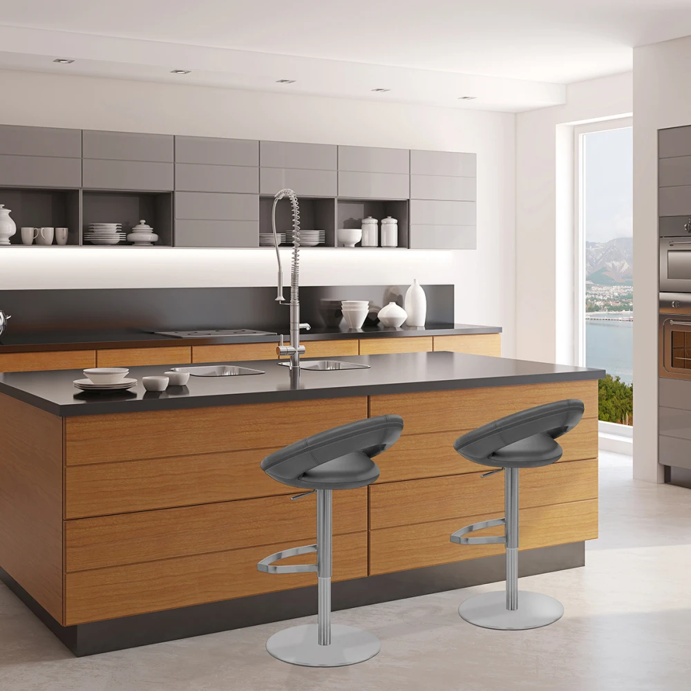 Der Retrolook ist Programm mit dem Barhocker Crescent. Ein Sitz aus gepolstertem Echtleder mit einer Rückenlehne in Bogenform, um ihren Rücken zu entlasten, eine Fußstütze in Form eines Fünfecks und ein Untergestell aus gebürstetem Chrom. Das Ganze ist höhenverstellbar und drehbar um 360°. Gummistreifen schützen Ihren Boden.