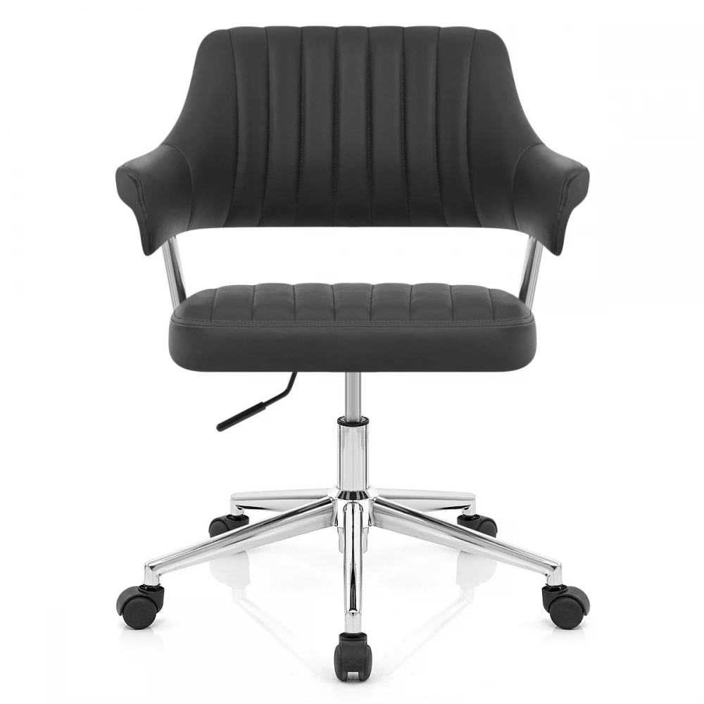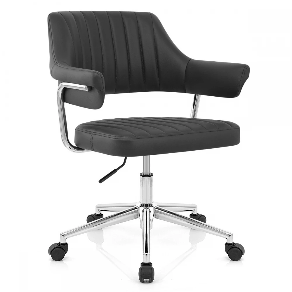 Ein Bürostuhl im Retro Look. Entscheiden Sie sich für den Skyline mit Kunstlederbezug und Rahmen aus poliertem Chrom mit 5 Rollen. Er ist ebenfalls mit einer Gasdruckfeder für eine einfache Höhenverstellung und einen 360° Drehmechanismus versehen.