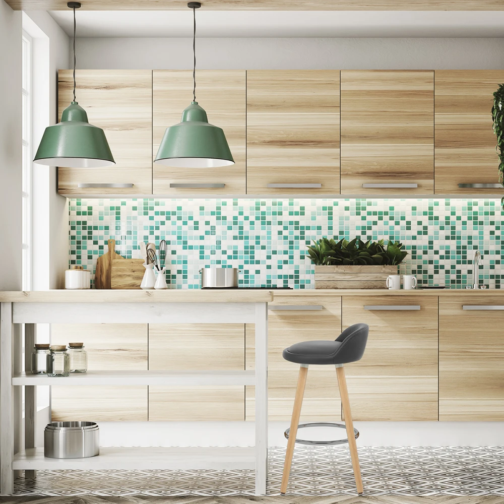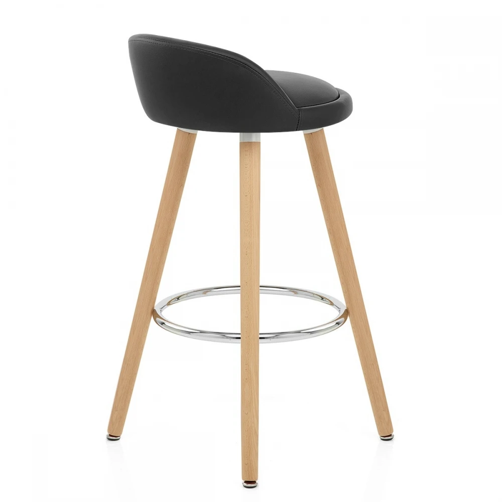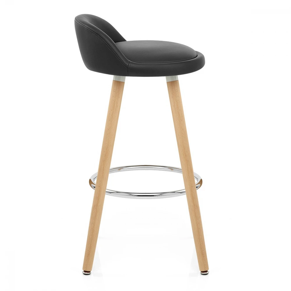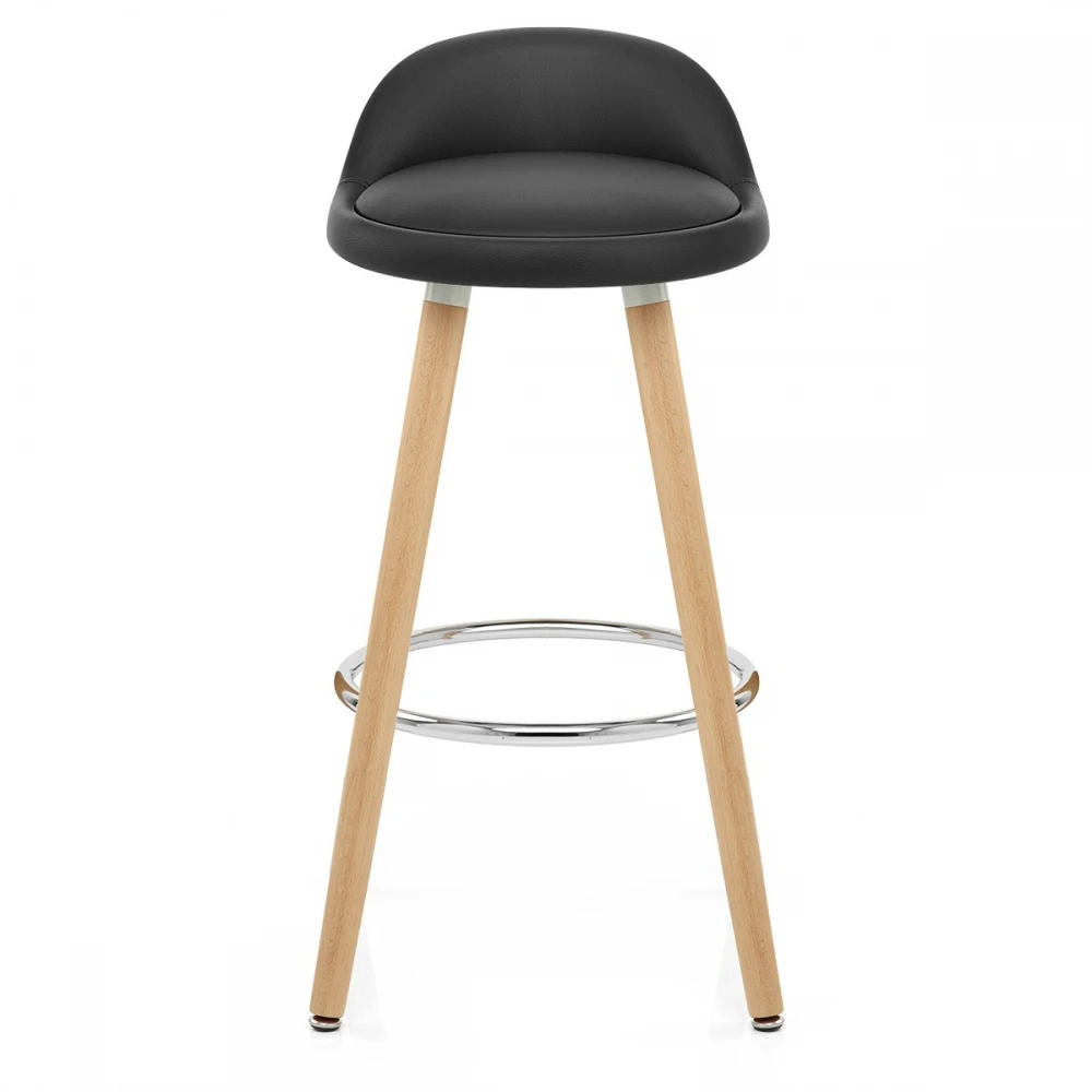 Der Barhocker Jive wird Sie durch seinen minimalistischen Stil begeistern. Sein Sitz ist aus sehr komfortablem gepolstertem Kunstleder gefertigt und hat eine kleine Rückenlehne für einen besseren Halt. Der runde Sitz ruht auf vier stabilen Beinen aus Holz, die durch eine kreisförmige Fußablage aus Chrom verbunden sind. Seine feste Höhe ist ideal für Ihre Frühstücksbar und Bodenschutzkappen verhindern Kratzer auf Ihrem Boden.