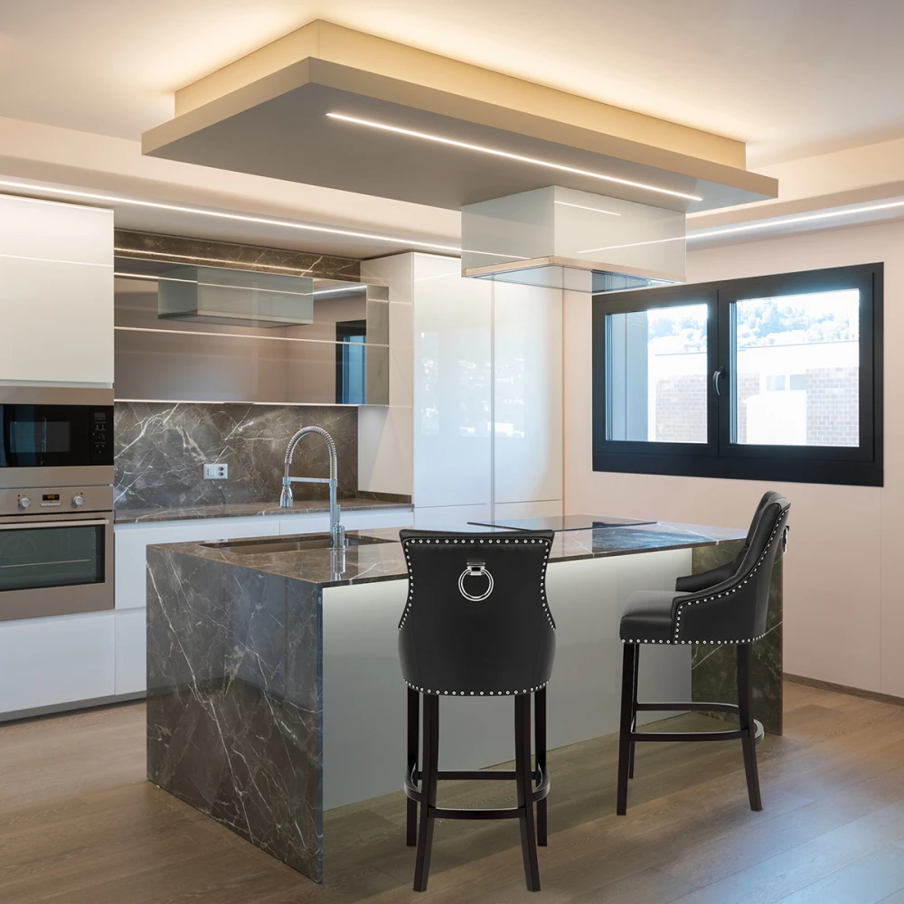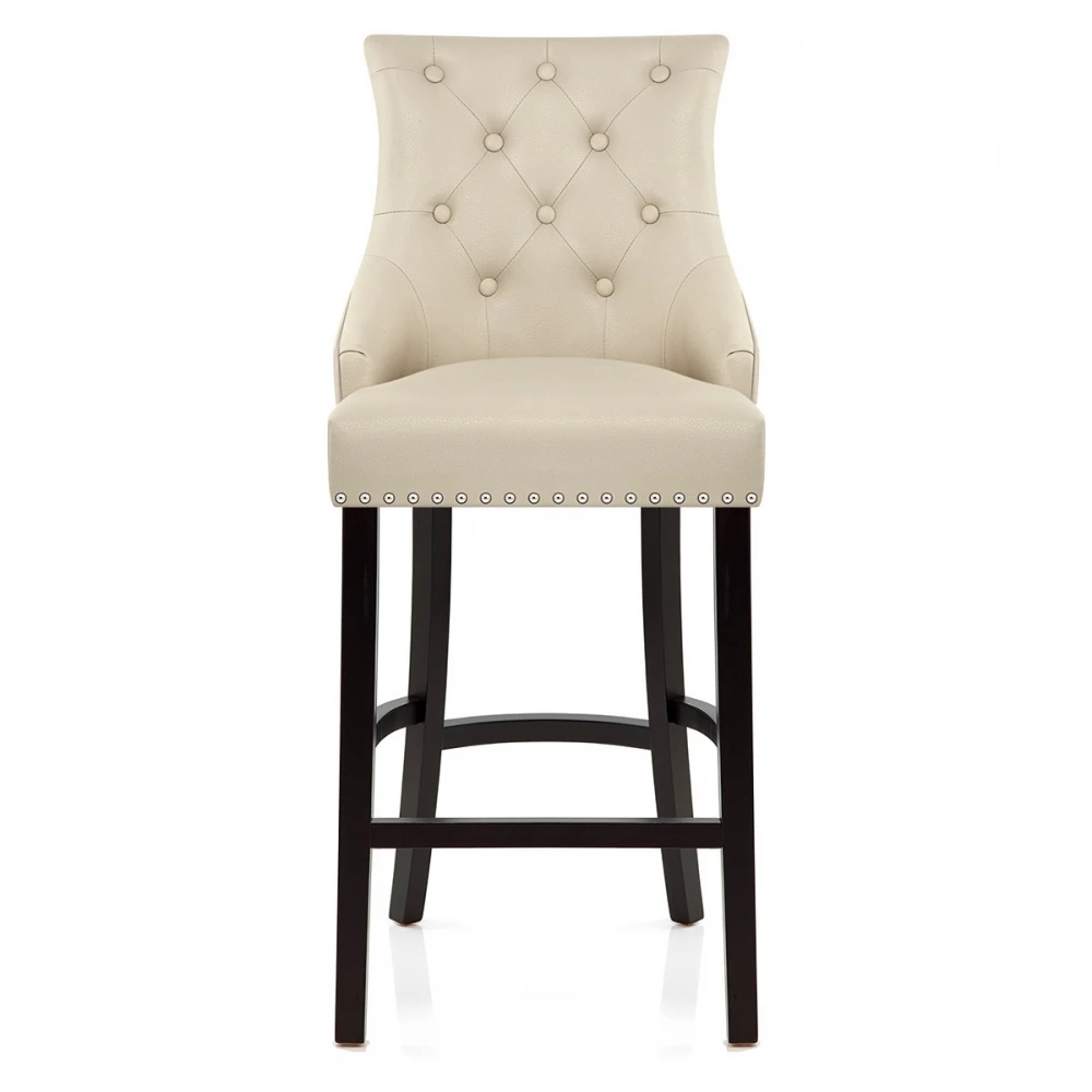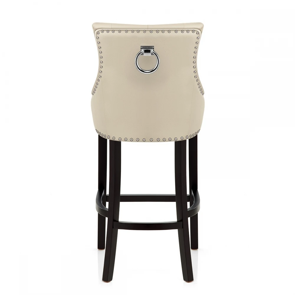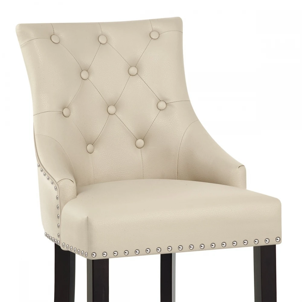 Ein Mix aus klassisch und modern mit einem Hauch von edel. Das Lederfaserstoff verleiht dem Raum den nötigen Luxus. Seine angenehme Sitzform macht aus ihm einen erhöhten Esszimmerstuhl mit gut gepolsterter und hoher Rückenlehne. Sein gesteppter Rücken und sein mit Nieten versehener Rand ziehen mit dem dekorativen Chromgriff an der Rückseite jedes Auge auf sich. Bodenschutzkappen an den dunkel lackierten Holzbeinen schonen Ihren Boden.