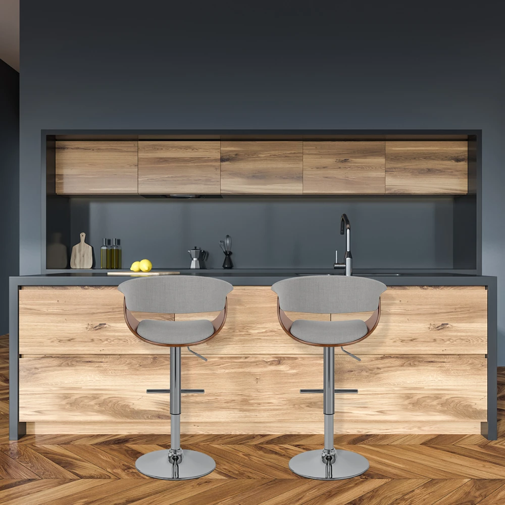 Er lädt zum Entspannen ein, der Barhocker Grafton. Seine gut gepolsterte Sitzschale im Walnussholzlook ist mit Stoff bezogen und seine Rückenlehne bietet Halt. Unter dem Sitz befindet sich ein um 360° drehbarer und dank eines Gas-Lift-Mechanismuses, höhenverstellbarer Chromfuss. Zum Schutz Ihres Bodens verfügt er über ein rutschfestes Plastikband.