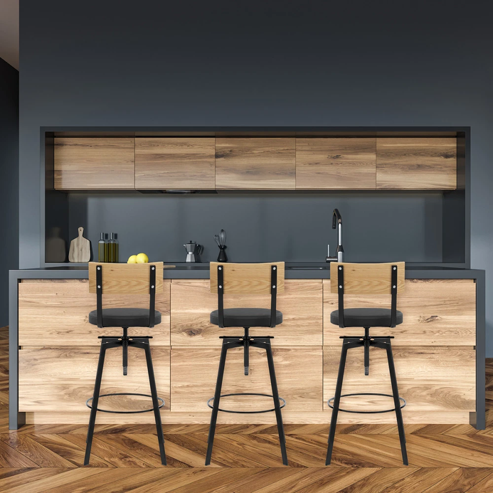Machen Sie einen einladenden Eindruck mit dem Barhocker Industriell Urban. Der gepolsterte Sitz hat eine handliche runde Form und ist mit Kunstleder bezogen, das ein glattes und komfortables Design anbietet. Das Eichenfinish der massiven Holzrückenlehne steht im Kontrast zu der Sitzfläche, die über zwei Metallstützen verbunden ist, die sich vom Gestell aus erstrecken. Der Sitz wird von einem Metallrahmen im Antikstil getragen. Ein verstellbarer und feststellbarer Gewindemechanismus unterhalb des Sitzes verleiht dem Hocker eine besondere Note und ermöglicht eine variable Höhe. Das vierbeinige Gestell enthält auch eine kreisförmige Fußstütze, die die Beine abstützt, um zusätzliche Stabilität zu gewährleisten. Unter jedem Bein befindet sich ein Schutzstopfen, um Schäden an Ihren Böden zu vermeiden.