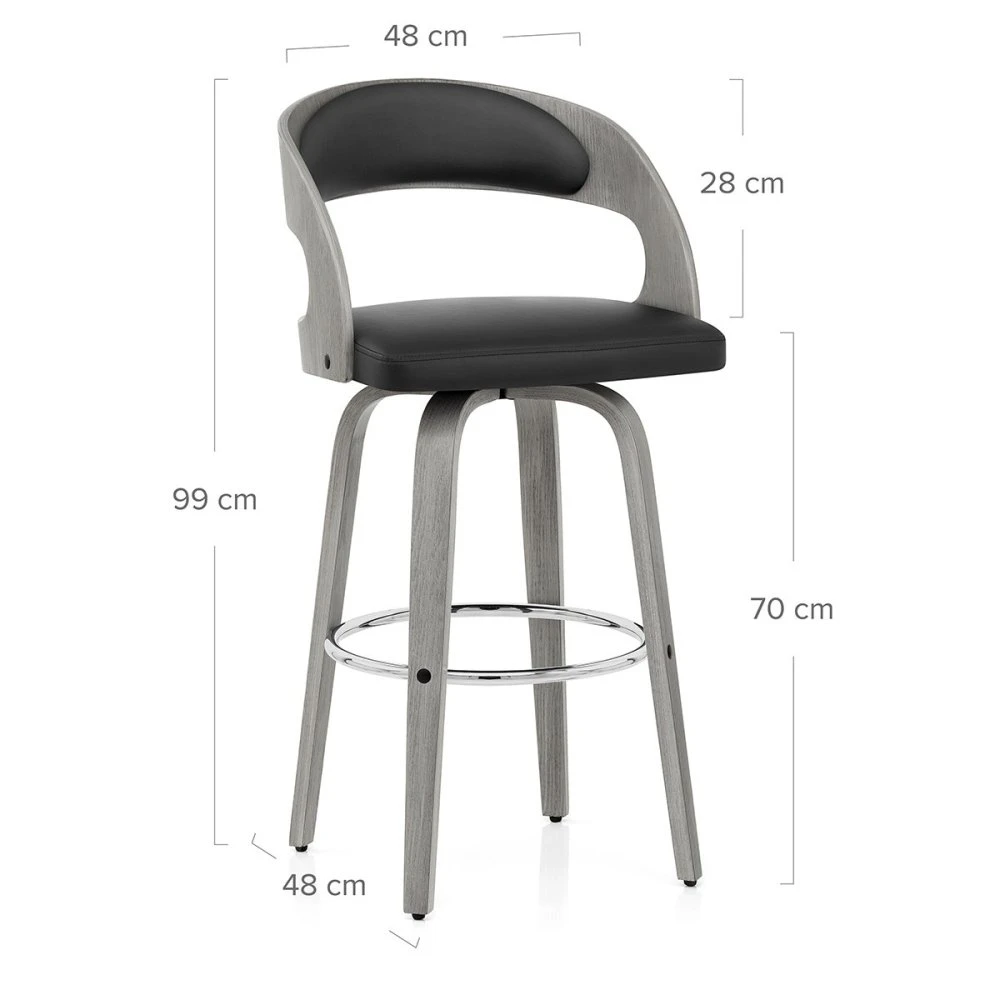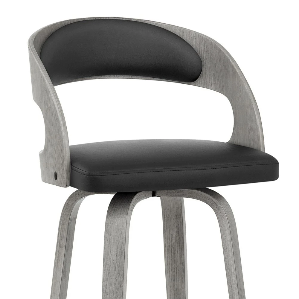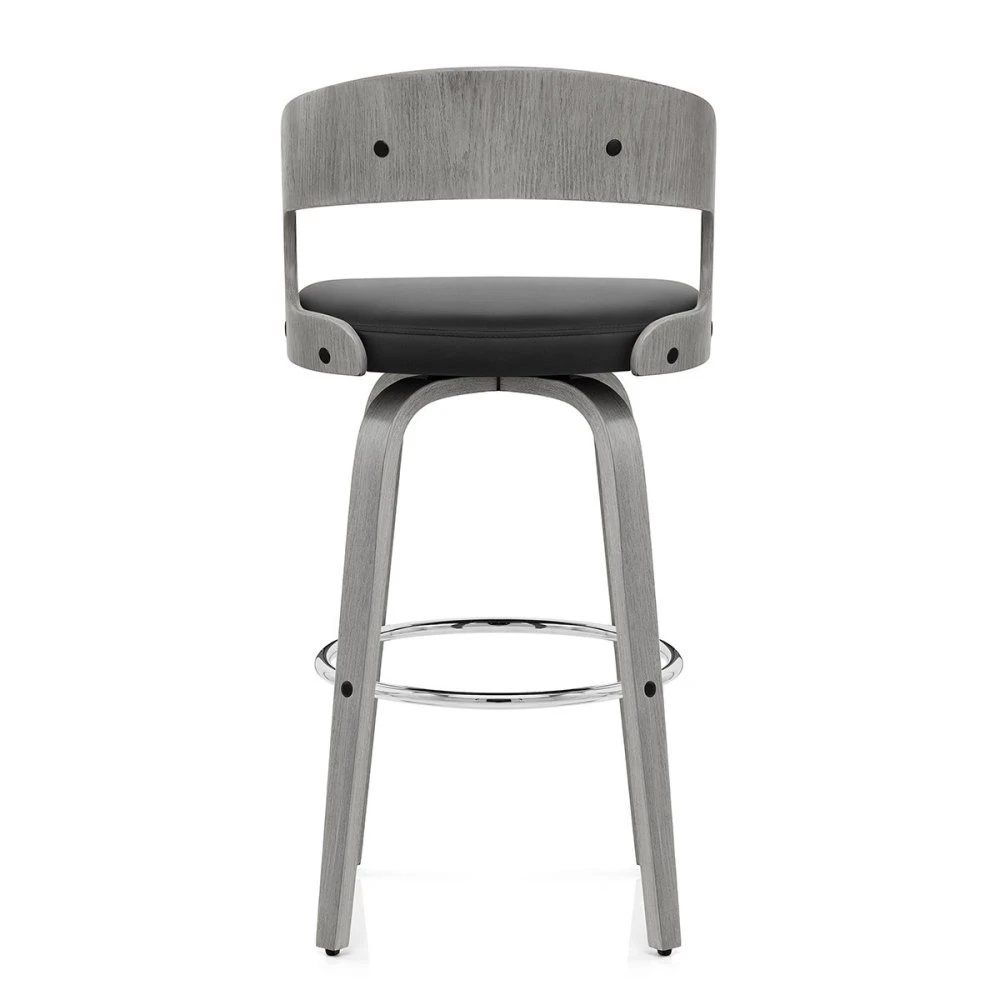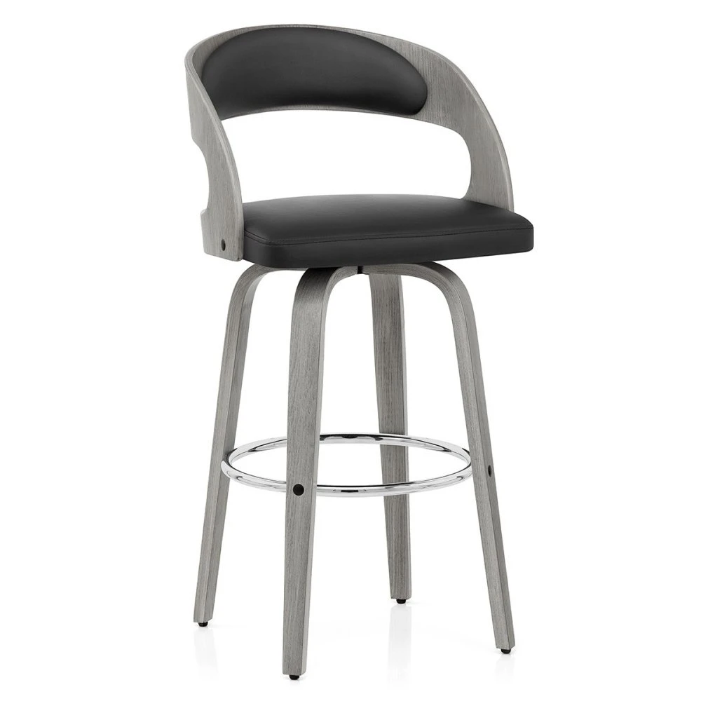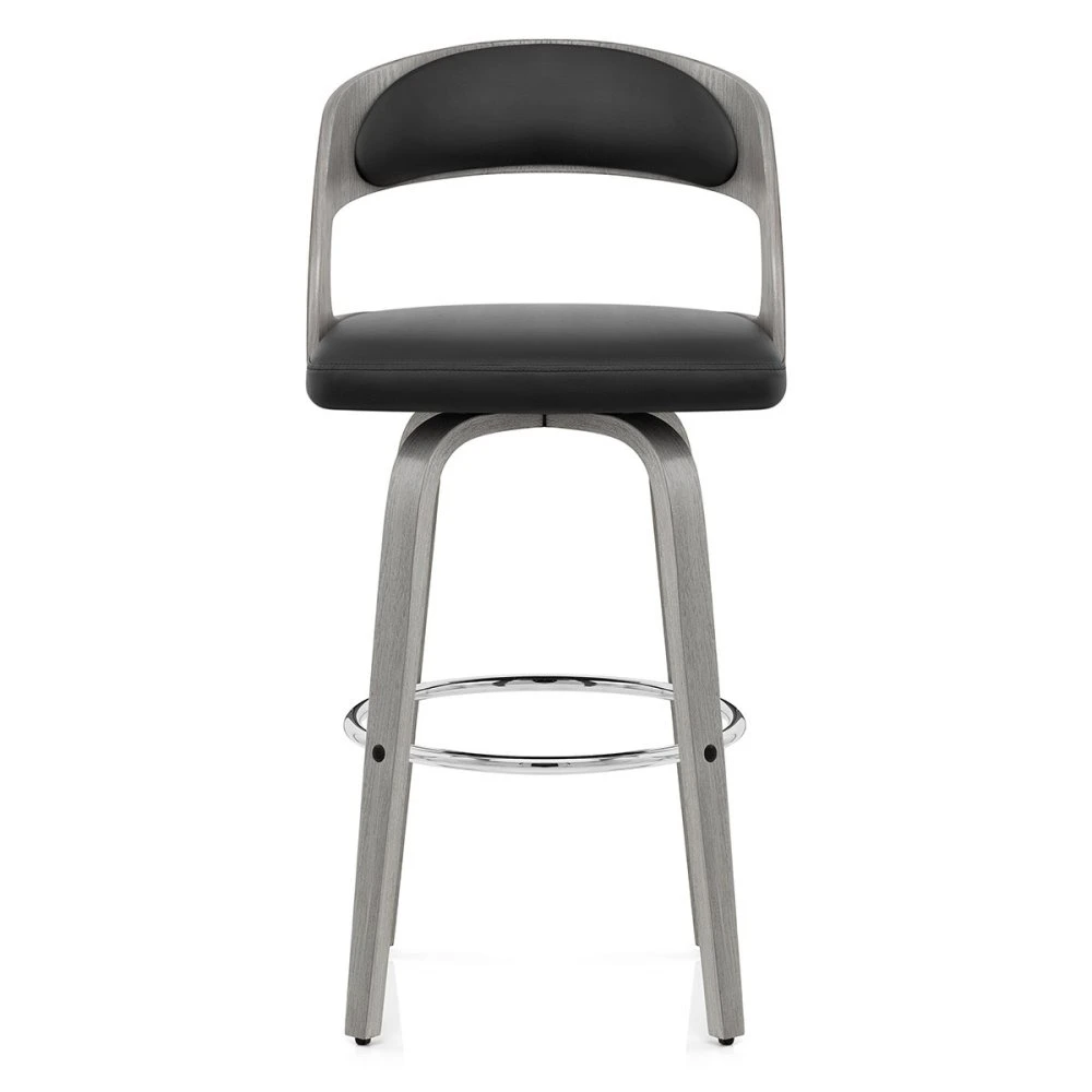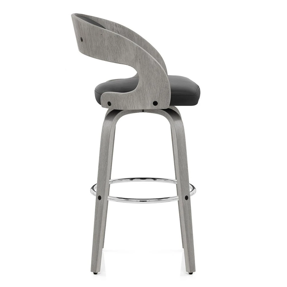 Erleben Sie ultimativen Komfort und Stil mit diesem exquisiten Hocker. Eine großzügig gepolsterte Sitzfläche wird von einer hohen Rückenlehne aus grauem Bugholz umrahmt, die Sie angenehm einschließt. Die Rückenlehne wurde nicht nur wegen ihrer Robustheit ausgewählt, sondern auch wegen ihres ästhetisch ansprechenden, vielseitigen Grautons, der perfekt mit dem unverwechselbaren Echtleder des Sitzes harmoniert. Um den Sitzkomfort weiter zu erhöhen, ist die Rückenlehne in der Mitte zusätzlich gepolstert. Das Gestell des Hockers ist in der gleichen grauen Holzoptik wie die Rückenlehne gestaltet und auf Küchenthekenhöhe angebracht. Es besteht aus vier glatten, stabilen Beinen, die von einer verchromten Fußstütze umgeben sind. Für zusätzliche Bequemlichkeit lässt sich die Sitzfläche um 360 Grad drehen. Die Beine sind mit vier verstellbaren Bodendübeln ausgestattet, die nicht nur Ihre Oberflächen vor Abdrücken schützen, sondern auch Bodenunebenheiten ausgleichen.