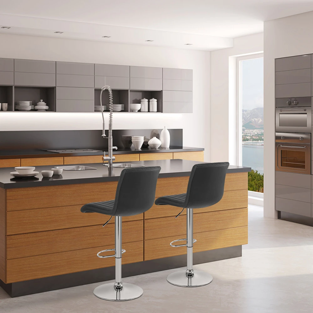 Unser Barhocker Debut aus echtem Leder ist perfekt geeignet Ihre Küche einladend zu gestalten. So verfügt er über eine Reihe von modischen Designmerkmalen, die eine gewisse Vielseitigkeit ausdrücken und in jedem Küchenbereich Platz finden. Die hochwertige Lederpolsterung machen den Debut zudem zu einer edlen und komfortablen Erscheinung, die durch eine hohe Rückenlehne mit vertikalen Nahtlinien noch ein zusätzliches Statement setzt. Das echte Leder der Sitzfläche wird zudem perfekt durch den polierten Chromrahmen des Gestells ergänzt. Die stützende, halbmondförmige Fußstütze aus poliertem Chrom sorgt zudem noch etwas mehr für Zweckmäßigkeit. Unter der Fußstütze sind Bodenschutzstopfen angebracht.