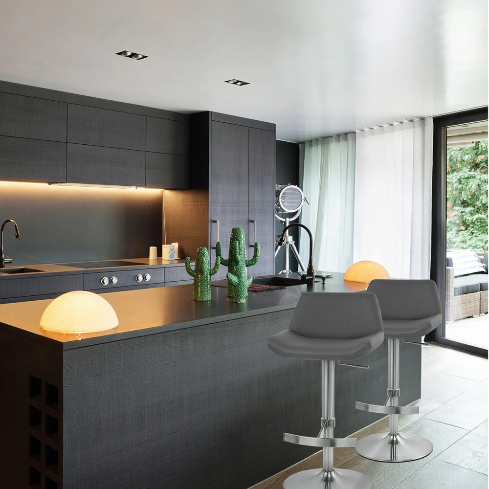 Unser Barhocker Christiana bietet Luxus zu einem vernünftigen Preis für Ihr Zuhause. Die Worte Charme und Stabilität definieren dieses exzellenten Stück wohl am besten. Der Echtlederbezug und das geschwungenen Sitzdesign des Christiana versprechen einen unfassbaren Sitzkomfort und lösen dieses Versprechen in Ihrem Heim ein. Die mittelhohe Rückenlehne des Hockers ist ebenfalls gepolstert und glatt verarbeitet. Der gebürsteten Stahlrahmen, der auf dem Fußkreuz und der gebogene Fußstütze sitzt, rundet das Äußere dieses Stuhls ab. Die variable Höhe und die 360-Grad-Drehung werden durch den Gasfedermechanismus des Hockers ermöglicht. Bodenschutz ist an der Unterseite des Gestells angebracht und schützt Ihren Boden vor Schrammen und Kratzern.