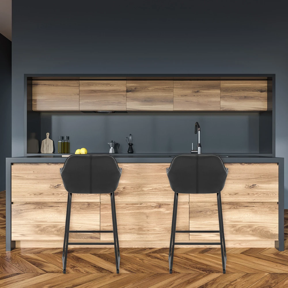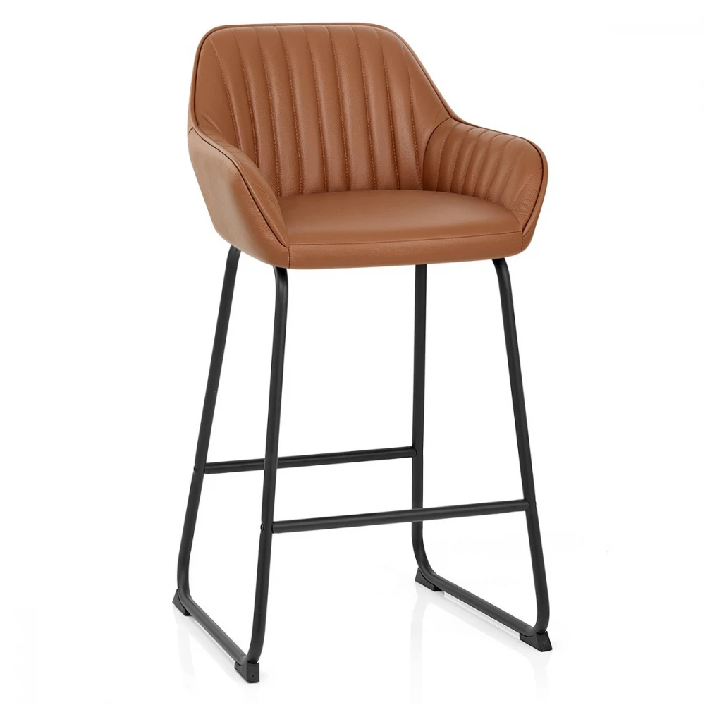 Der Kanto Barhocker besitzt ein sicheres Stilgefühl, welches ein Statement in jedem Heim setzt. Geneigte Armteile sind mit vertikalen Nahtlinien gemustert und stimmen sich mit der inneren Rückenlehne ab, was zu einer angenehmen Retro-Ästhetik führt. Das glatte Sitzpolster ist gepolstert und mit luxuriösem Echtleder überzogen. Das stabiles Gestell umfasst gebogene Beinteile, die durch massive Metallstangen an der Vorder- und Rückseite des Hockers verstrebt und verbunden sind. Ein schwarzes rundet das Gestell ab. Ein Bodenschutz ist unter den Gestellbeinteilen angebracht.