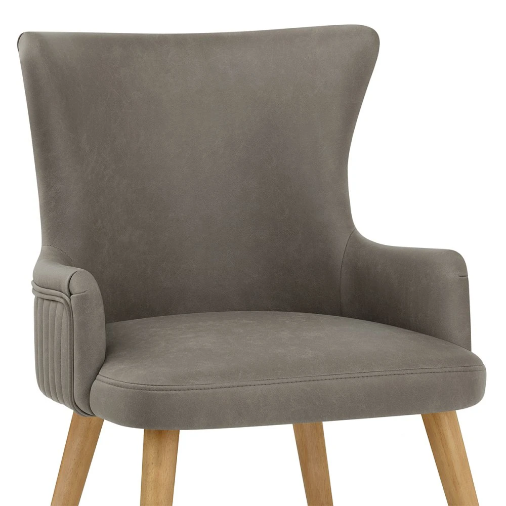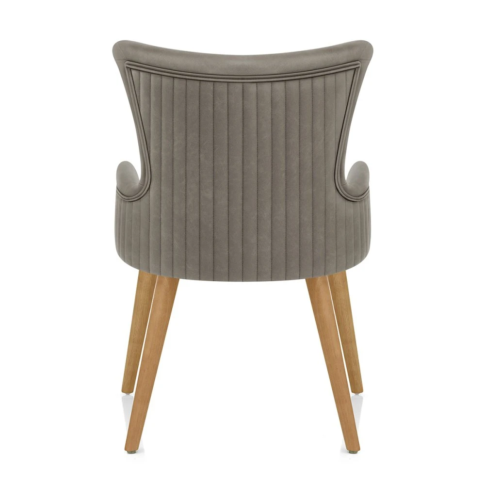 Mit seiner klassischen Optik, die von modernen Trends inspiriert wurde, ist der Diablo Esszimmerstuhl mit Eichenholz-Finish die perfekte Sitzgelegenheit für Ihr Zuhause. Der bequeme Retro-Sessel passt zu einer Vielzahl von Einrichtungsstilen. Die Sitzfläche und die moderne Flügellehne sind mit glänzendem Kunstleder überzogen, das die formschöne Kontur des Stuhls unterstreicht. Auf der Rückseite der hohen Rückenlehne erwarten Sie vertikale Nähte, die für einen subtilen Streifeneffekt sorgen. Stützende Armlehnen und ein gut gepolstertes Sitzkissen sorgen für den Komfort, während die vier Massivholz-Beine in Eiche für die nötige Festigkeit und Stabilität sorgen. Die zylindrisch geformten Beine verjüngen sich zum Boden hin und sind mit verstellbaren Schutzfüßen ausgestattet, die Ihrem Fußboden zugute kommen.