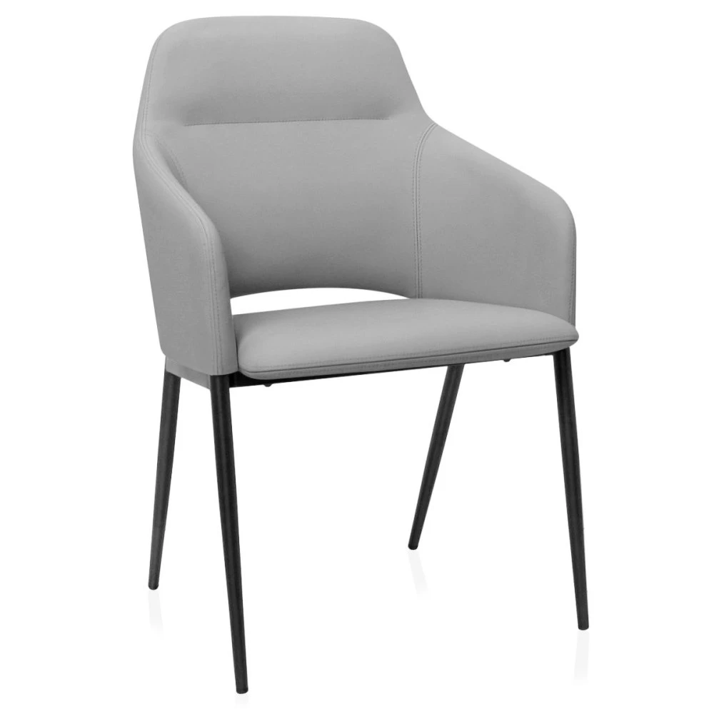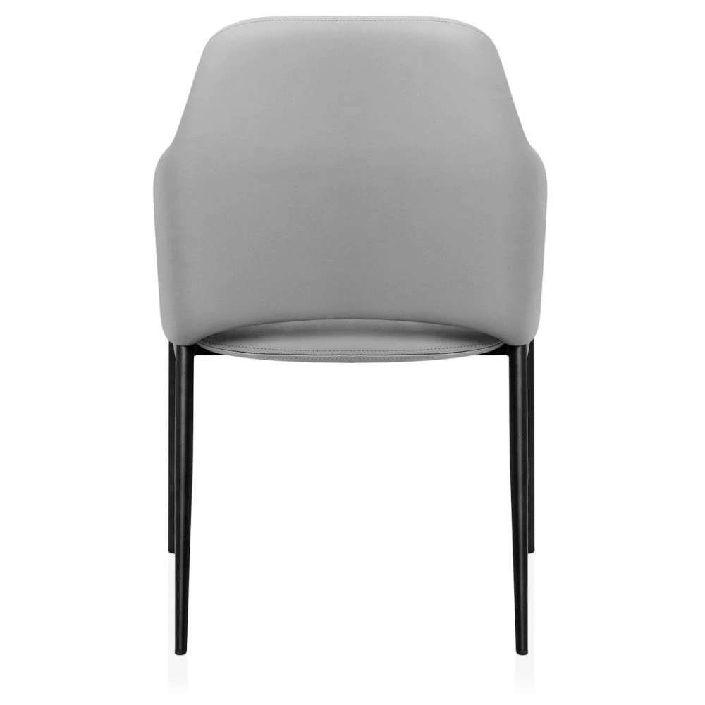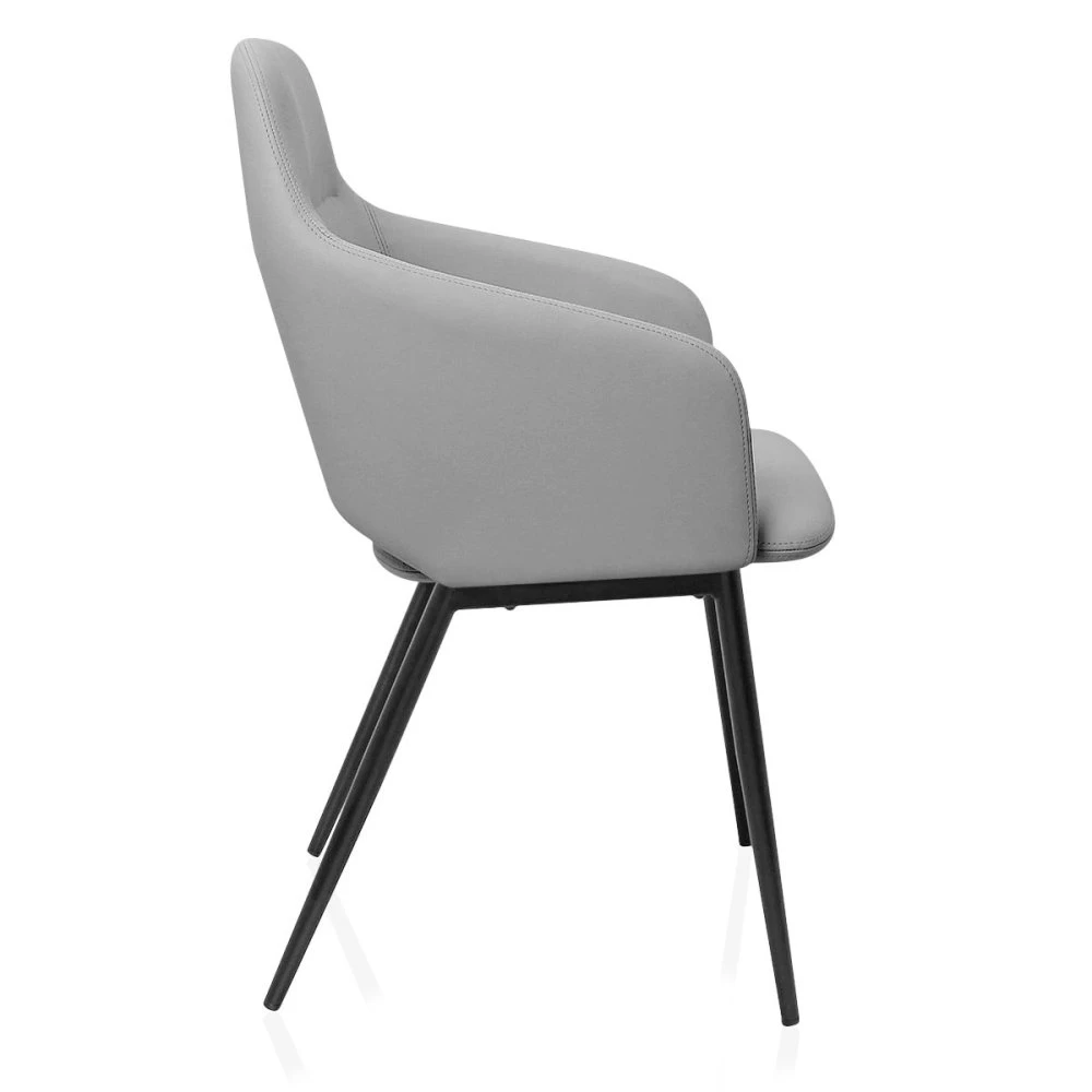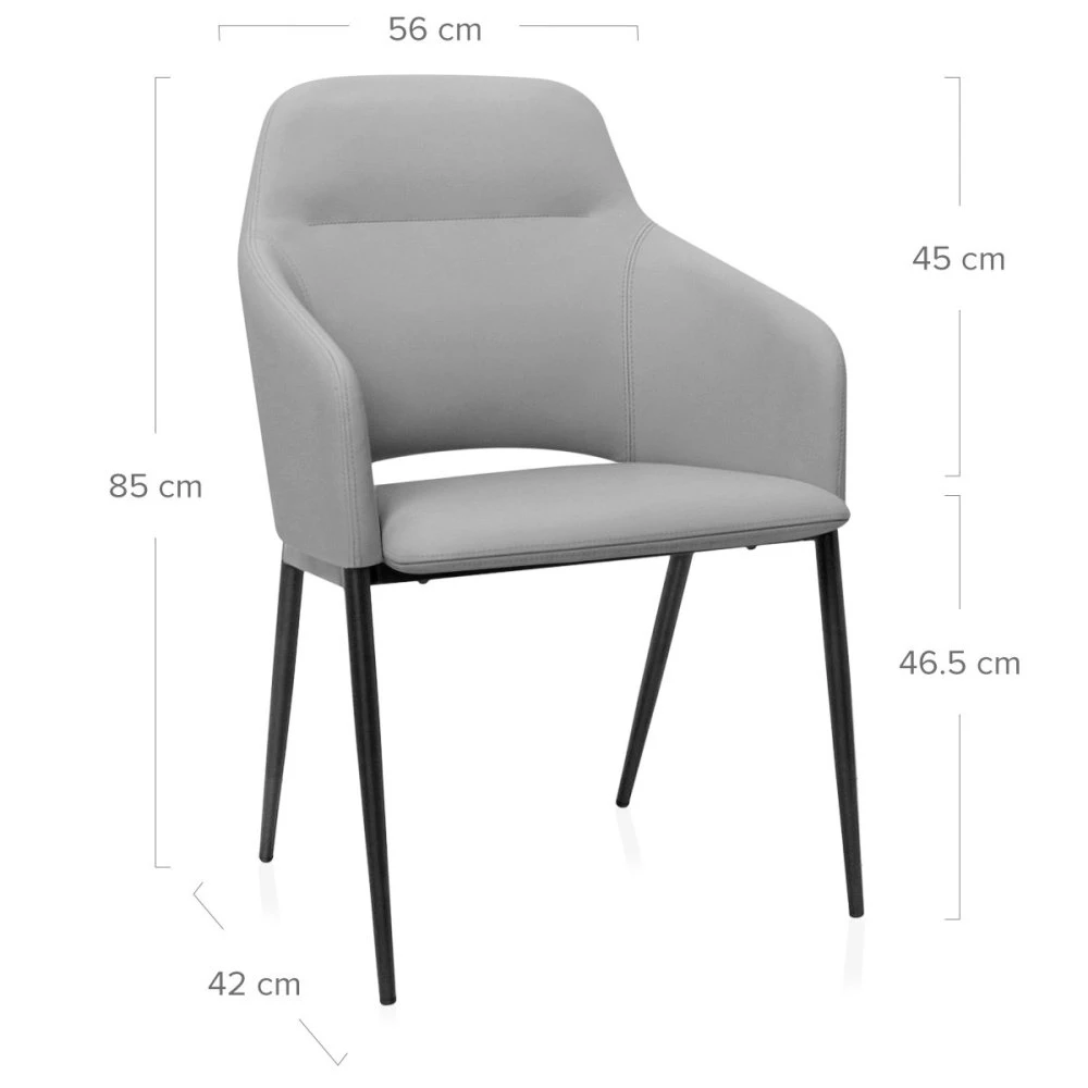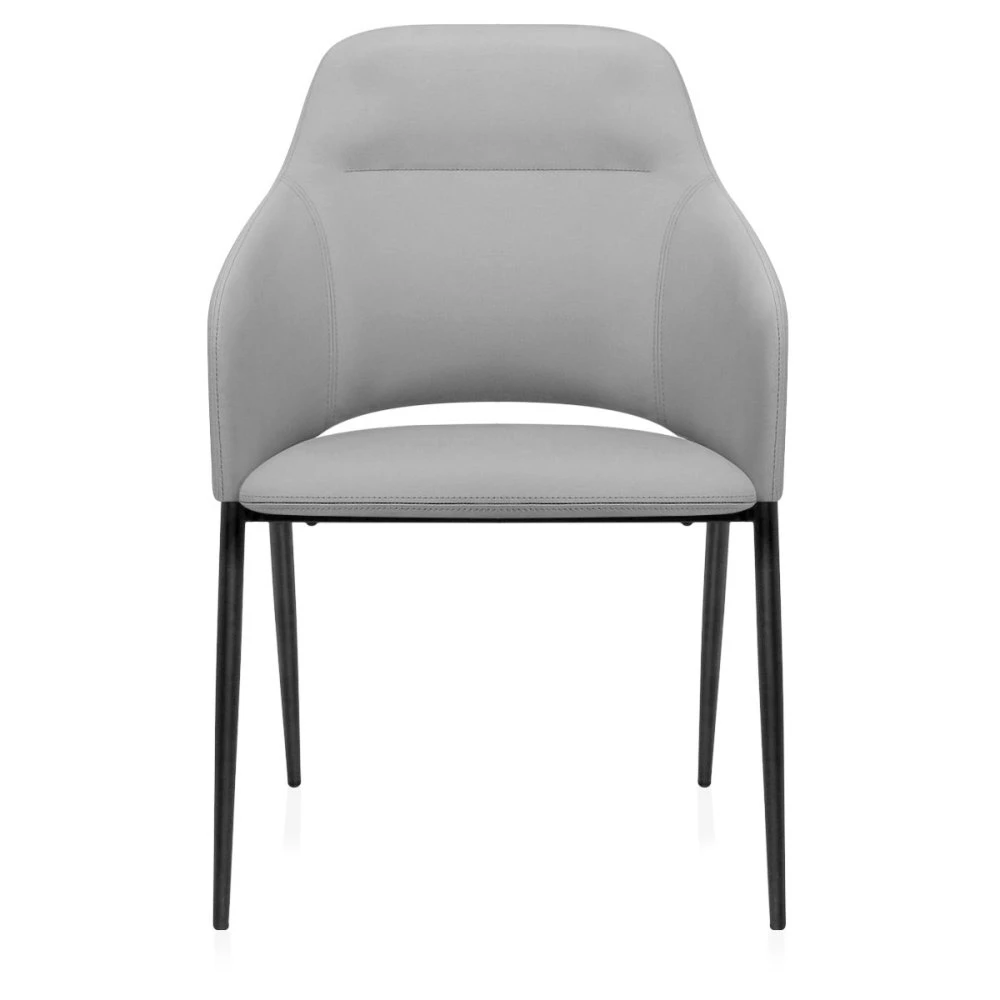 Dieser moderne Esszimmerstuhl ist unschlagbar, wenn es um Aussehen und Komfort geht. Lassen Sie sich von diesem hochwertigen Möbelstück in den Bann ziehen und genießen Sie Ihr Essvergnügen in vollen Zügen. Das weich gepolsterte Sitzkissen wird von umschließenden Armlehnen und einer hohen Rückenlehne perfekt ergänzt. Der elegante Sitz ist mit einem charmanten Kunstlederbezug umhüllt und verfügt über einen praktischen gewölbten Ausschnitt in der Rückenlehne, der das einfache Tragen ermöglicht und auch einen visuellen Eindruck hinterlässt. Vier solide Beine, die sich zum Boden hin verjüngen und ein stabiler Metallsockel setzen einen weiteren charmanten Akzent. Der Stuhl ist für die meisten Standard-Küchentische geeignet. Jeder Fuß ist mit einem Schutzstopfen versehen, um Ihre Böden vor Kratzern zu schützen.