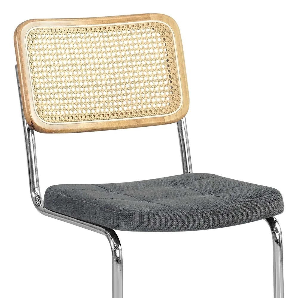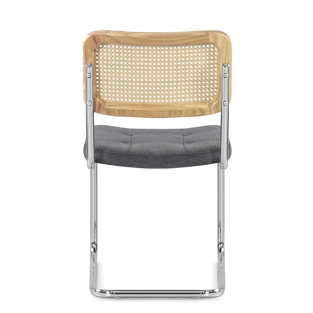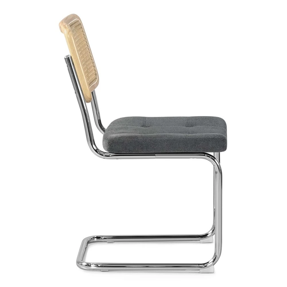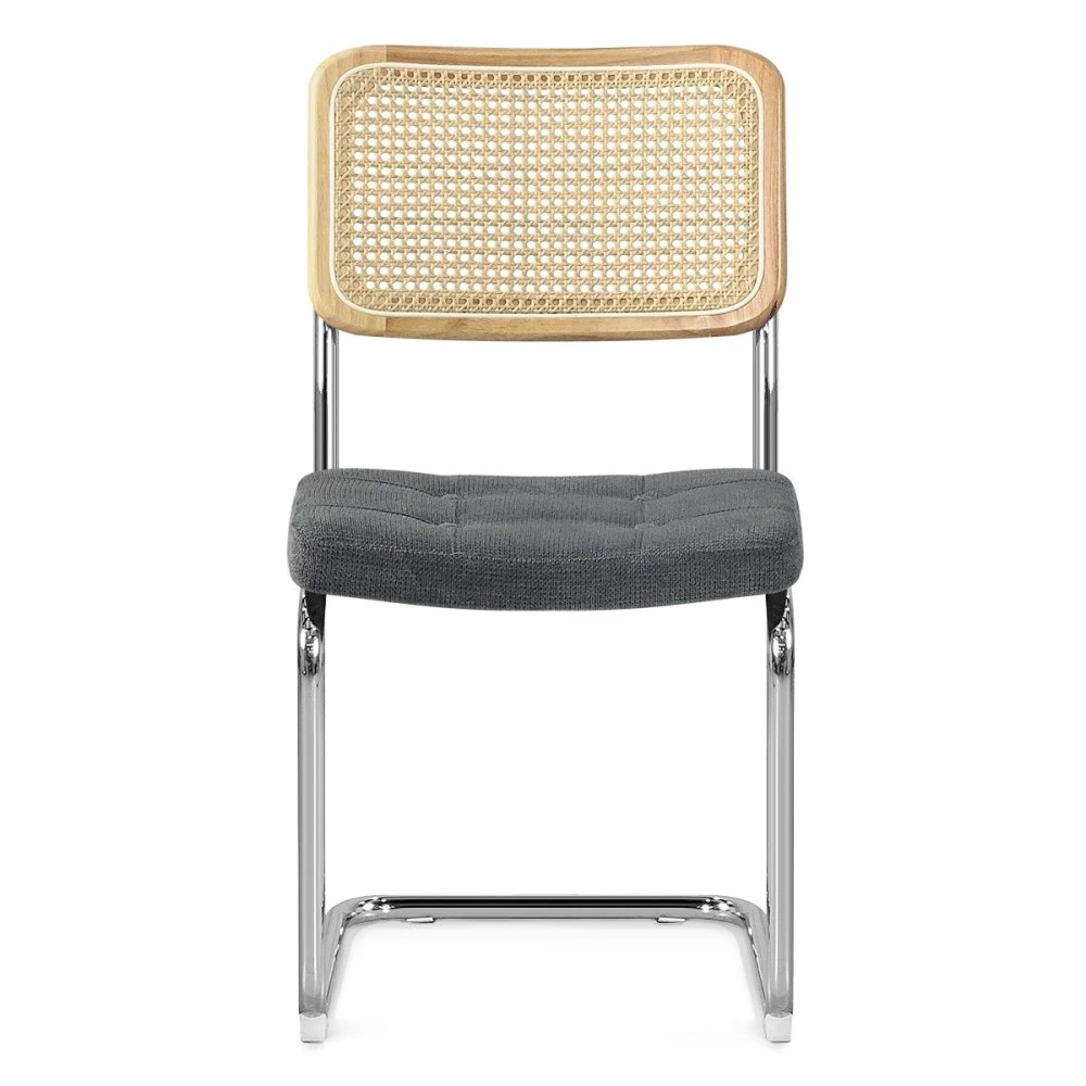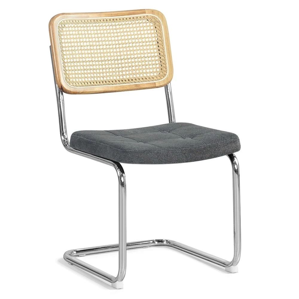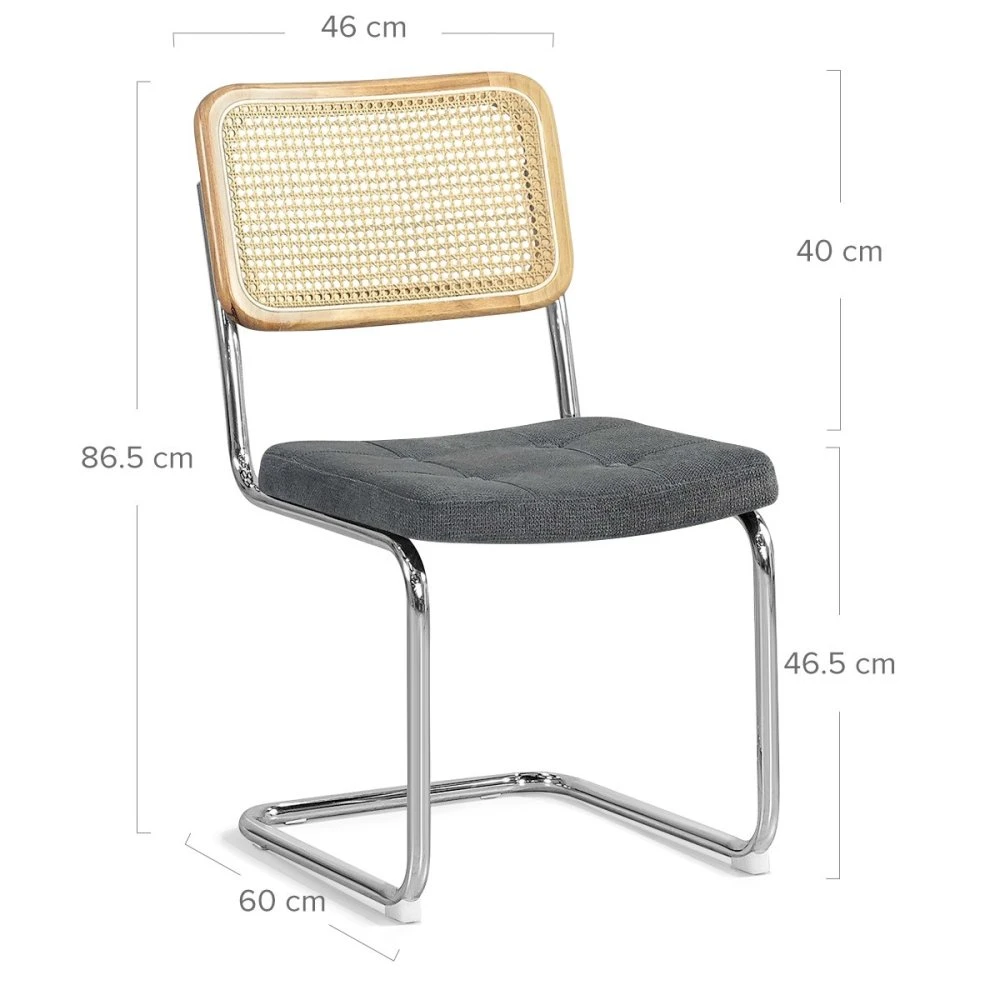 Das flippige Design des Cala Esszimmerstuhls ist die perfekte Mischung aus 70er-Jahre-Inspiration und zeitgenössischem Stil und verleiht dem Stuhl einen coolen und einzigartigen Look. Die klassisch gestaltete zweiteilige Sitzfläche ist mit einem bequemen, quadratischen Polster und einer halbhohen Rückenlehne ausgestattet, die durch verchromte Stangen mit dem Sitz verbunden ist. Die Rückenlehne besteht aus einem Rohrgeflecht, das von einem Holzrahmen mit Eichenoptik eingerahmt wird. Zu dem Materialmix gehört auch ein gewebter Strukturstoff. Das freitragende Gestell ist eine coole Ergänzung für jeden Essbereich. Die schlichte Rohrstruktur mit polierter Chromoberfläche hat Flair und setzt ein Statement. Dieser Stuhl ist nicht höhenverstellbar und hat die perfekte Höhe für Ihren Essbereich. Schutzdübel unter dem Gestell sorgen dafür, dass Ihr Fußboden nicht versehentlich beschädigt wird.