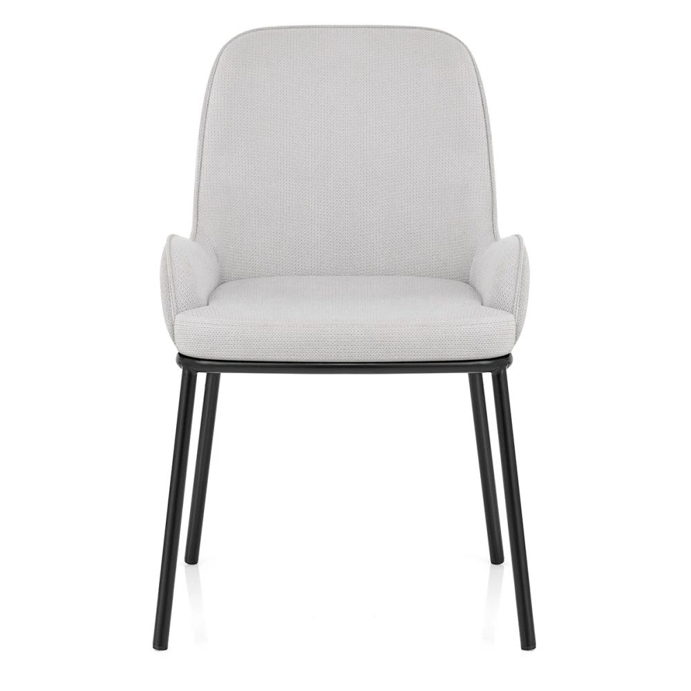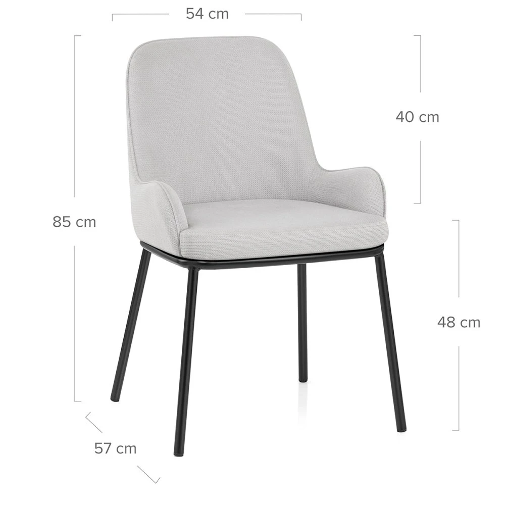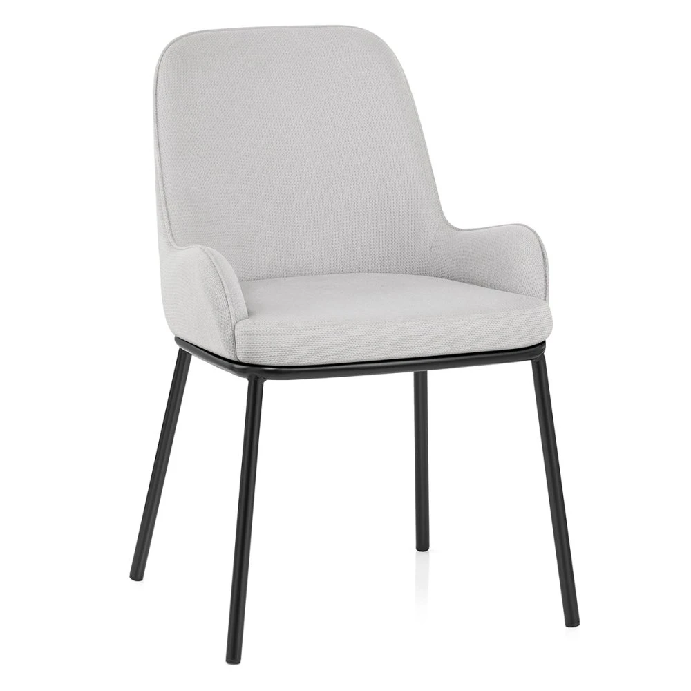 Entdecken Sie den Cameo Esszimmerstuhl, ein Meisterwerk des Möbeldesigns, das mit seinem einzigartigen Mix aus Retro-Charme und modernem Komfort jede Einrichtung aufwertet. Mit seiner großzügig gepolsterten Sitzfläche und der stützenden, hochgezogenen Rückenlehne, umhüllt von einem eleganten perlgrauen Stoffbezug, bietet dieser Stuhl ein unvergleichliches Sitzerlebnis. Die hohe Rückenlehne im hinteren Teil des Stuhls fällt nach unten hin ab und umschließt das Sitzkissen an zwei Seiten, um Sie beim Sitzen noch mehr zu unterstützen. Ein starker Stuhl braucht ein starkes Fundament, weshalb der Cameo Stuhl mit Metallbeinen ausgestattet ist. Die Oberseite der Beine ist fest mit dem Rand des Sitzes verbunden, während die Beine selbst durch eine Metallumrandung, die die Unterseite des Sitzes einfasst, verstärkt sind. Jedes Bein ist mit Bodendübeln versehen, die das Risiko von Abdrücken auf Ihren Oberflächen minimieren.
