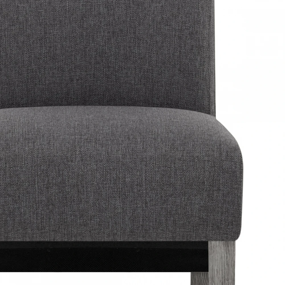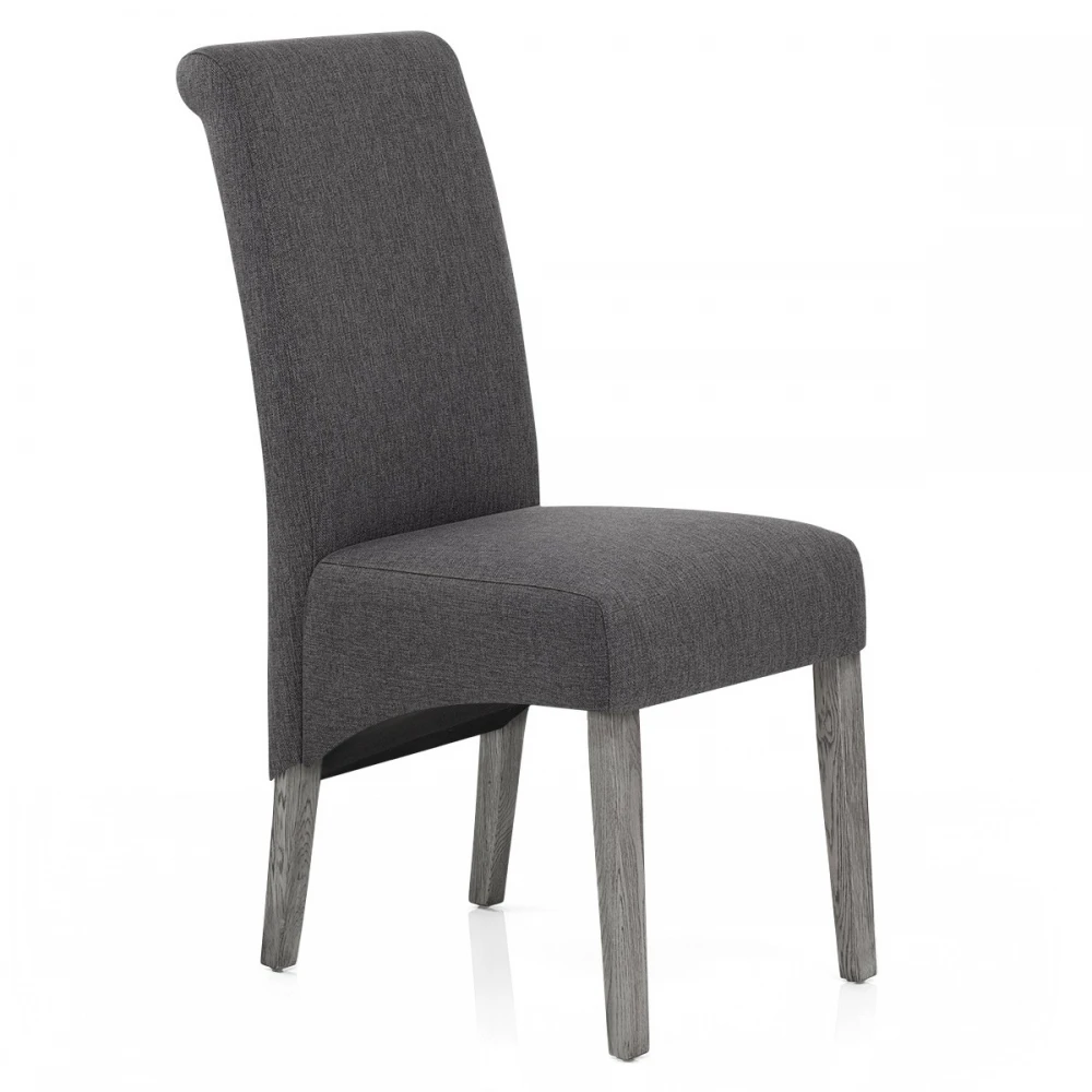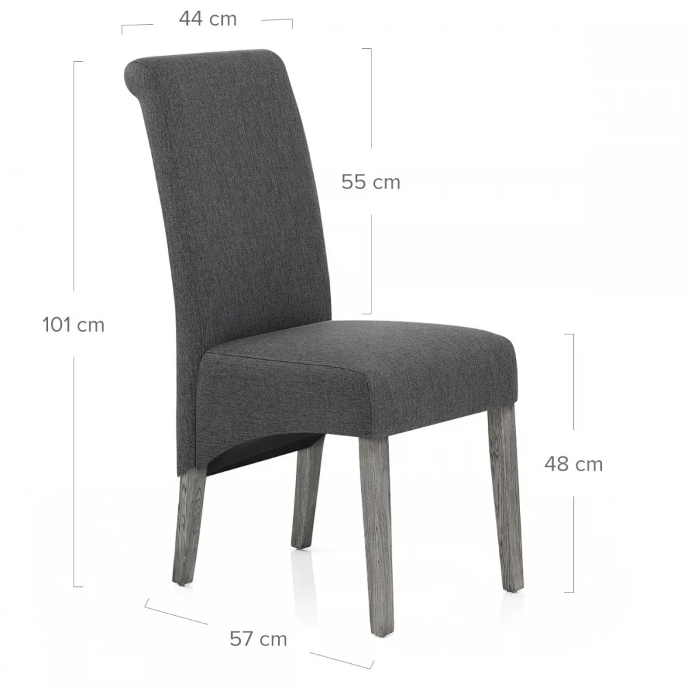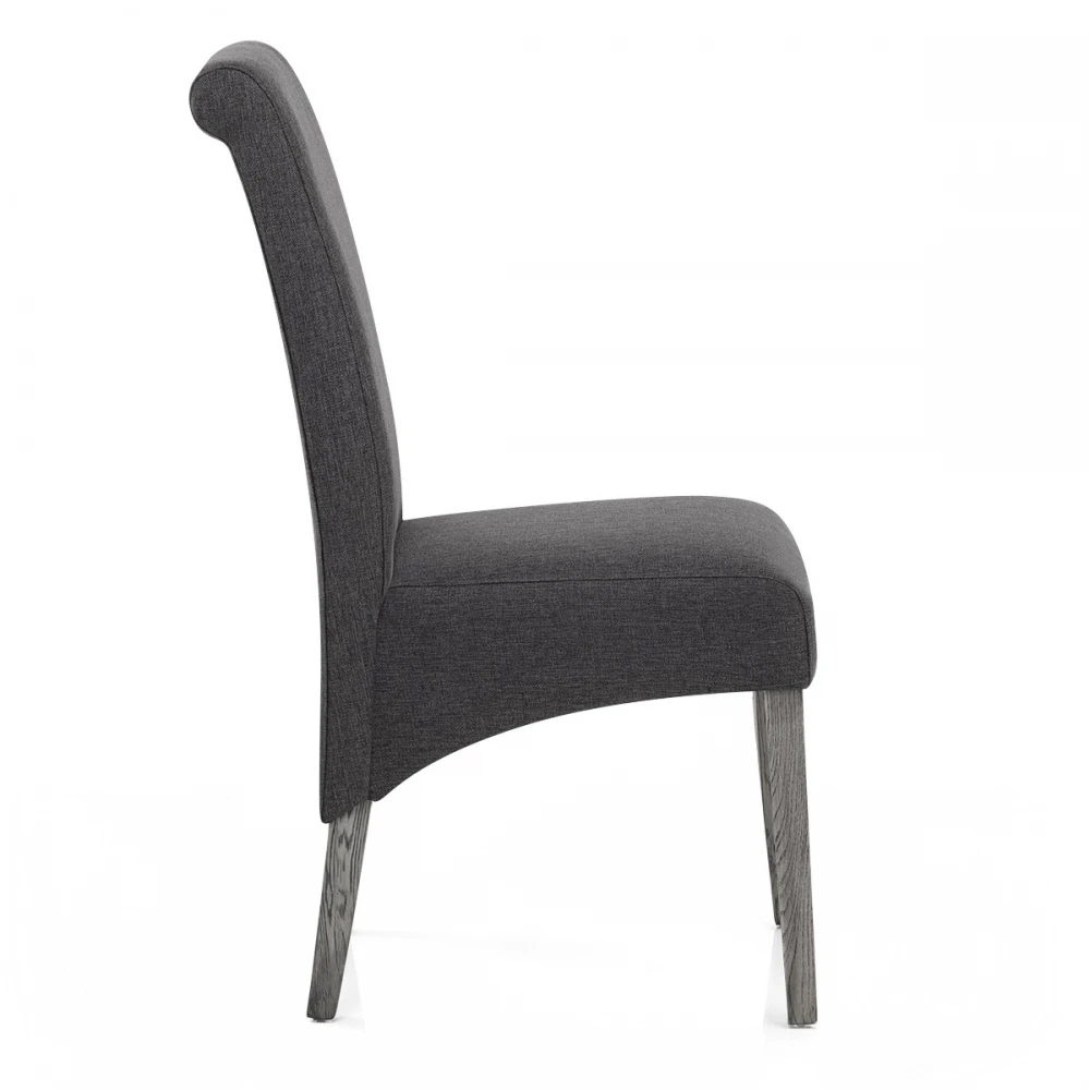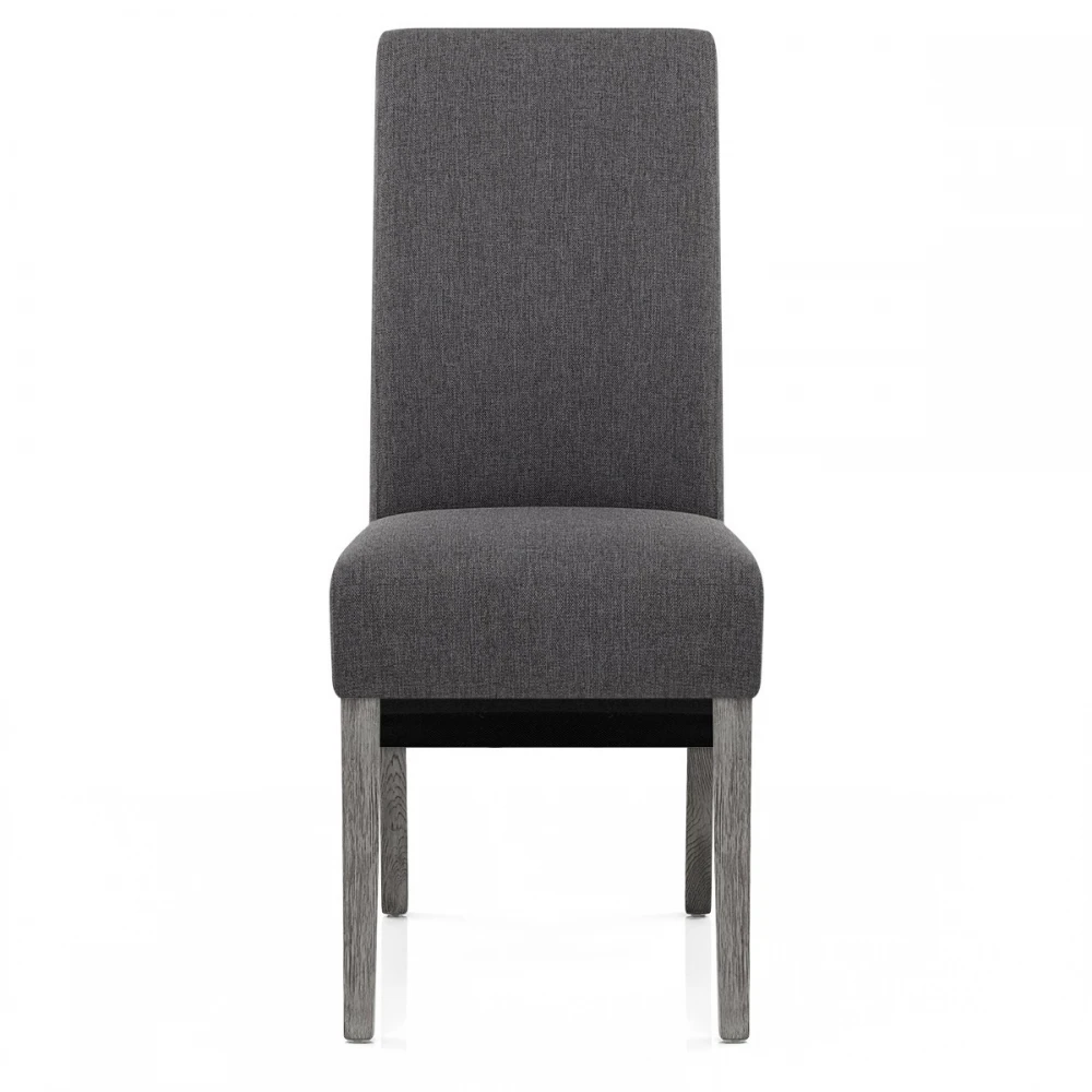 Der Carlo Esszimmerstuhl ein zeitloses und traditionlelles Design. Dunkelgrauer Stoff polstert den gesamten Sitz und ist mit hoher Dichte für maximalen Komfort in Ihrem Essbereich gefüllt. Den klassischen Stil hebt die unterstützende längliche Rückenlehne hervor, die sich unterhalb des Sitzkissens nach unten krümmt. Der starke Vierfußrahmen ist aus massivem Eichenholz und ergänzt den Sitz mit seiner zeitgemäßen grauen Oberfläche. Weitere Funktionen werden mit den Schutzstöpseln unter den Beinen hinzugefügt, damit Ihr Boden gepflegt bleibt.