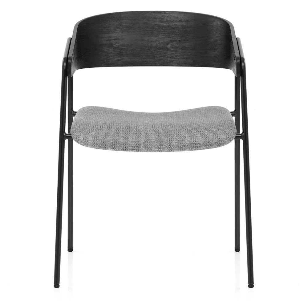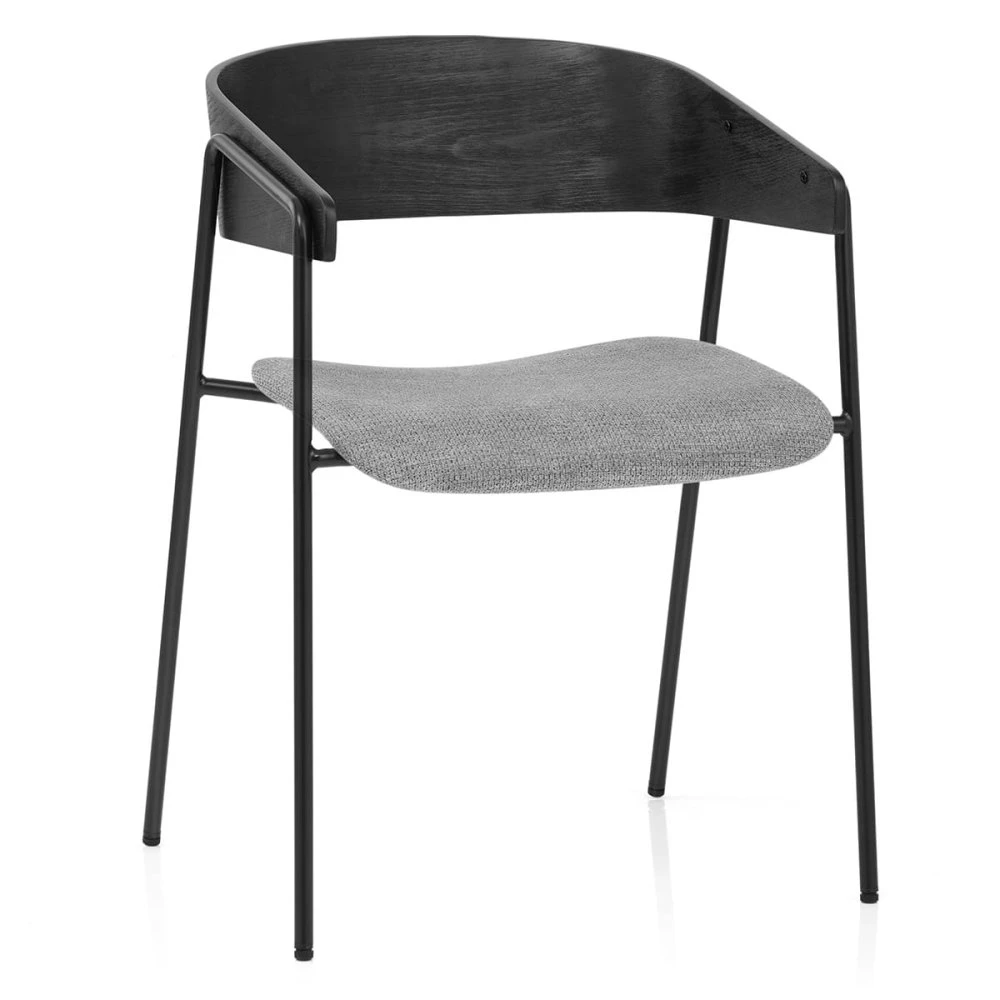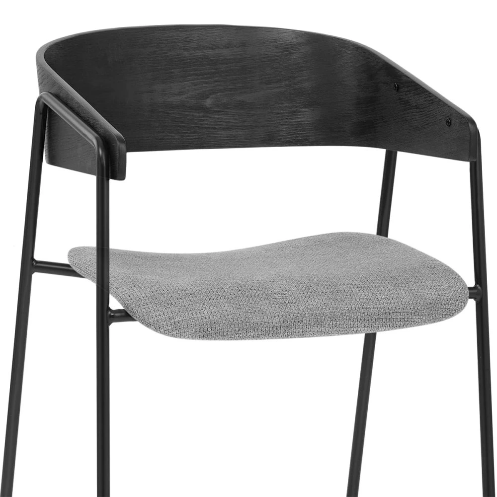 Mit seiner klaren Silhouette und dem minimalistischen Design vereint der Lauren Esszimmerstuhl rustikale Strukturen auf einzigartige und trendige Weise mit modernem Stil. Das pralle Sitzkissen, umhüllt von hochwertigem Stoff, bietet hervorragenden Halt und Komfort. Die Rückenlehne aus schwarzem Bugholz ist halbmondförmig und wird von verlängerten Beinen getragen, die auch die Armlehnen des Stuhls bilden. Die kontrastierenden Texturen der Sitzfläche werden durch die harmonischen Farben Grau und Schwarz stilvoll vereint. Zwei der vier Beine sind miteinander verbunden und bestehen aus einem einzelnen Metallrohr, das zu einer offenen Trapezform gebogen ist. Diese Beine ragen über die Sitzfläche hinaus und stützen die Rückenlehne, um sie vom Sitzpolster fernzuhalten. Um Ihre Fußböden zu schützen, sind am Ende jedes Beins schützende Bodenstopfen angebracht.