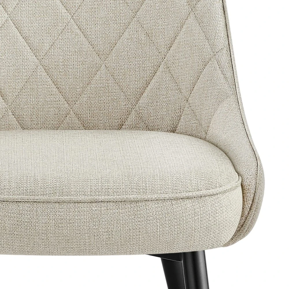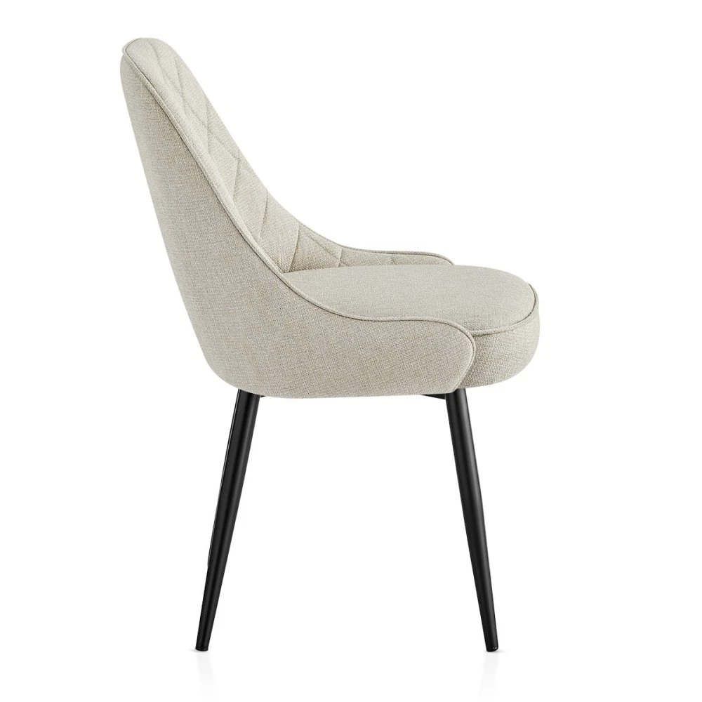 Gönnen Sie sich wahren Komfort mit dem Robyn Esszimmerstuhl mit Stoffbezug. Egal, ob für eine schnelle Mahlzeit oder eine große Gesellschaft, dieser Stuhl fügt sich nahtlos in moderne und stilvolle Umgebungen ein und schafft eine einladende Atmosphäre für Sie und Ihre Gäste. Das gepolsterte Sitzkissen lädt zum entspannen ein und wird von der hohen Rückenlehne teilweise umschlossen, die sich sanft neigt und zwei Seiten bildet, die entlang des Sitzpolsters verlaufen. Die Rückenlehne ist mit eleganten, abgesteppte Rautenmuster verziert, und die Stuhlkante wird durch eine auffällige Paspel abgerundet. Der gesamte Sitzbereich ist mit luxuriösem Stoff bezogen. Der stabile Metallrahmen mit vier Beinen ist schwarz pulverbeschichtet und verbreitert sich nach unten hin, um eine optimale Sitzqualität und Zuverlässigkeit zu gewährleisten. Der Stuhl ist um 360-Grad drehbar und hat ein fußbodenschonendes Design.