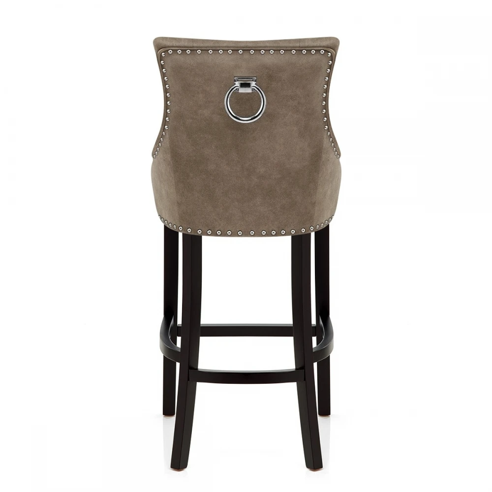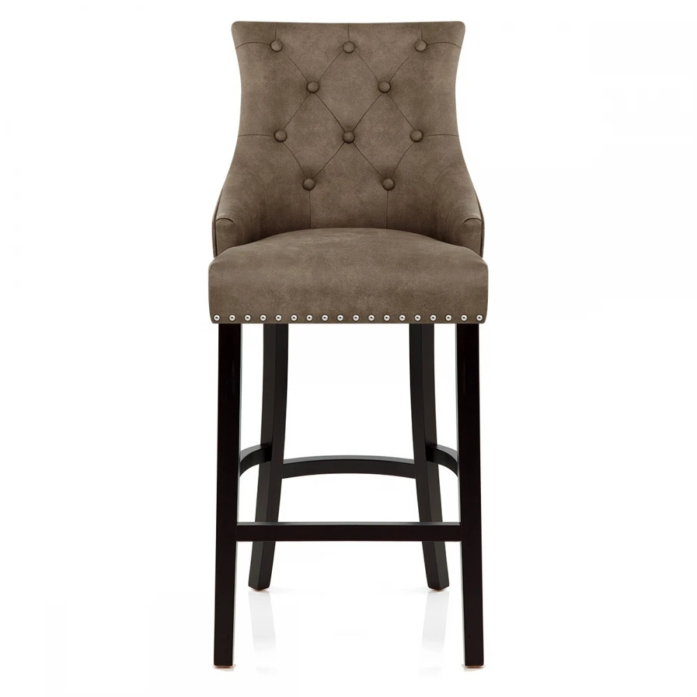 Der Ascot Barhocker Antik ist ein wunderschönes Möbelstück, das sowohl rustikalen als auch königlichen Stil vermittelt. Umgeben von antikem braunem Kunstleder für eine stilvolle ländliche Ästhetik, ist der Sitz dank seines gegürteten Rahmens und hohen Rückens unglaublich bequem. Die Rückseite selbst hat gesteppte Knöpfe, und auf der Rückseite sitzt ein großer Chromring. Passend zum Ring sind Chromnieten, die sowohl den Sitz als auch die Rückenlehne begrenzen. Aus massivem Holz wird der Rahmen mit fester Höhe gebildet, der ein elegantes schwarzes Satin-Finish verleiht. Die vier Beine und die Fußstütze an der Vorderseite des Designs bilden das Modell für Ihre Bequemlichkeit. Schließlich sind Gummistopfen unter den Beinen enthalten, um sicherzustellen, dass Ihr Boden geschützt ist.