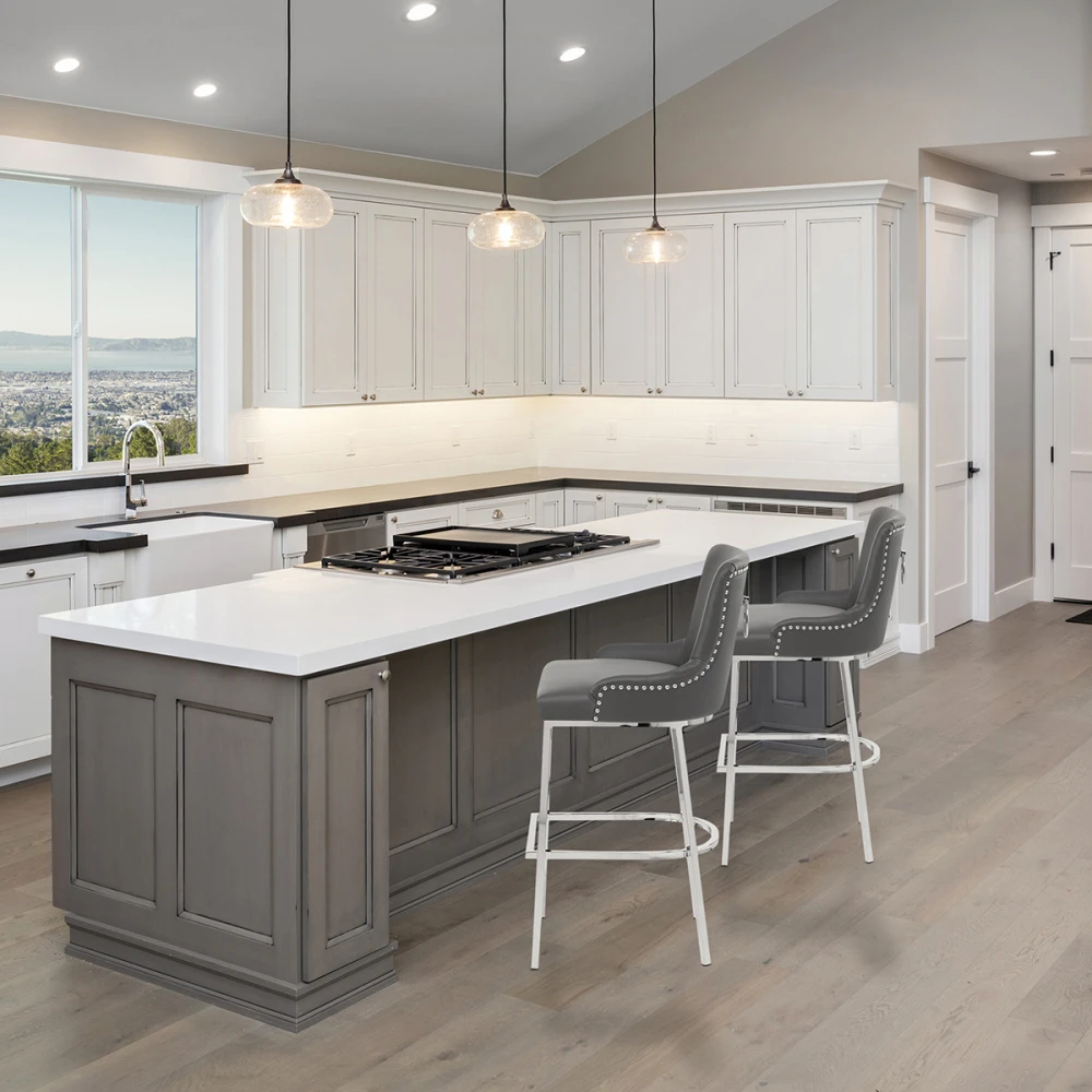 Der Bliss Barhocker ist ein moderner Stil. Glamouröses Kunstleder polstert den Sitz und die hohe Rückenlehne für mehr Komfort. Die Rückenlehne verfügt über einen prächtigen Chromring mit verchromter Knopfleiste auf der Rückseite. Der Rahmen in fester Höhe und besteht aus vier verchromten Beinen. Diese werden durch Verstrebungen verstärkt und verfügen über eine praktische Fußstütze. Schützende Bodenstopfen vervollständigen das Design und ermöglichen die Verwendung auf einer Vielzahl von Oberflächen, wodurch der Bliss zu einem standfesten und stilvollen Möbelstück wird.