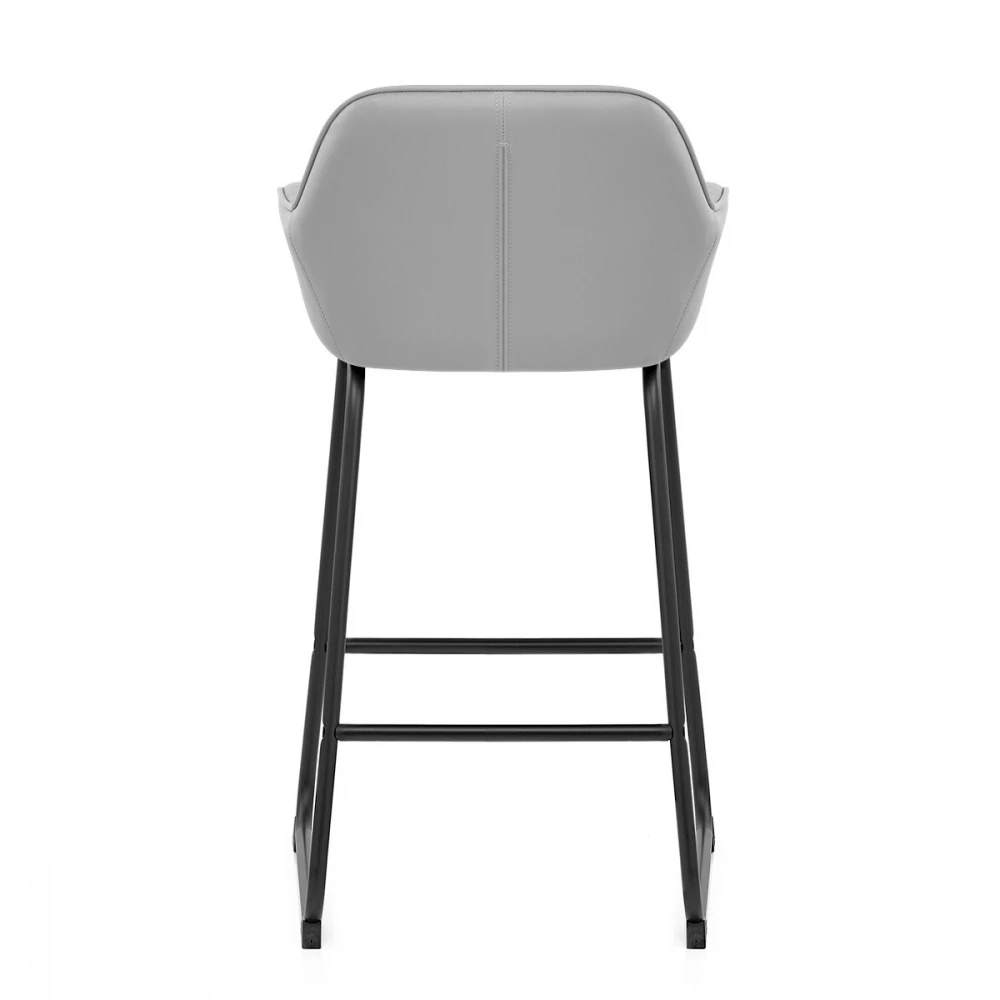 Der Kunstleder Barhocker Kanto ist ein dezentes Statement-Piece, das den kombinierten Aussehen von Retro und modernem Design liefert. Der schönem Kunstlederbarhocker Kanto bietet ein Höchstmaß an Komfort und Raffinesse. Vertikale Nähte an der Rückenlehne und den Stützarmlehnen bilden einen Kontrast zum gepolsterten Polster und vermitteln das Vintage-Feeling des Sitzes. Unter dem Sitz befindet sich ein antikes schwarzes Gestell mit satinierter Oberfläche. Der Hocker wird in Höhe der Küchenstange hergestellt, und das schlanke Metallgestell ist mit zwei Stangen verspannt, von denen eine als Fußstütze fungiert. Entlang der Basis des Rahmens befinden sich Schutzfüße, um den Boden zu schonen.