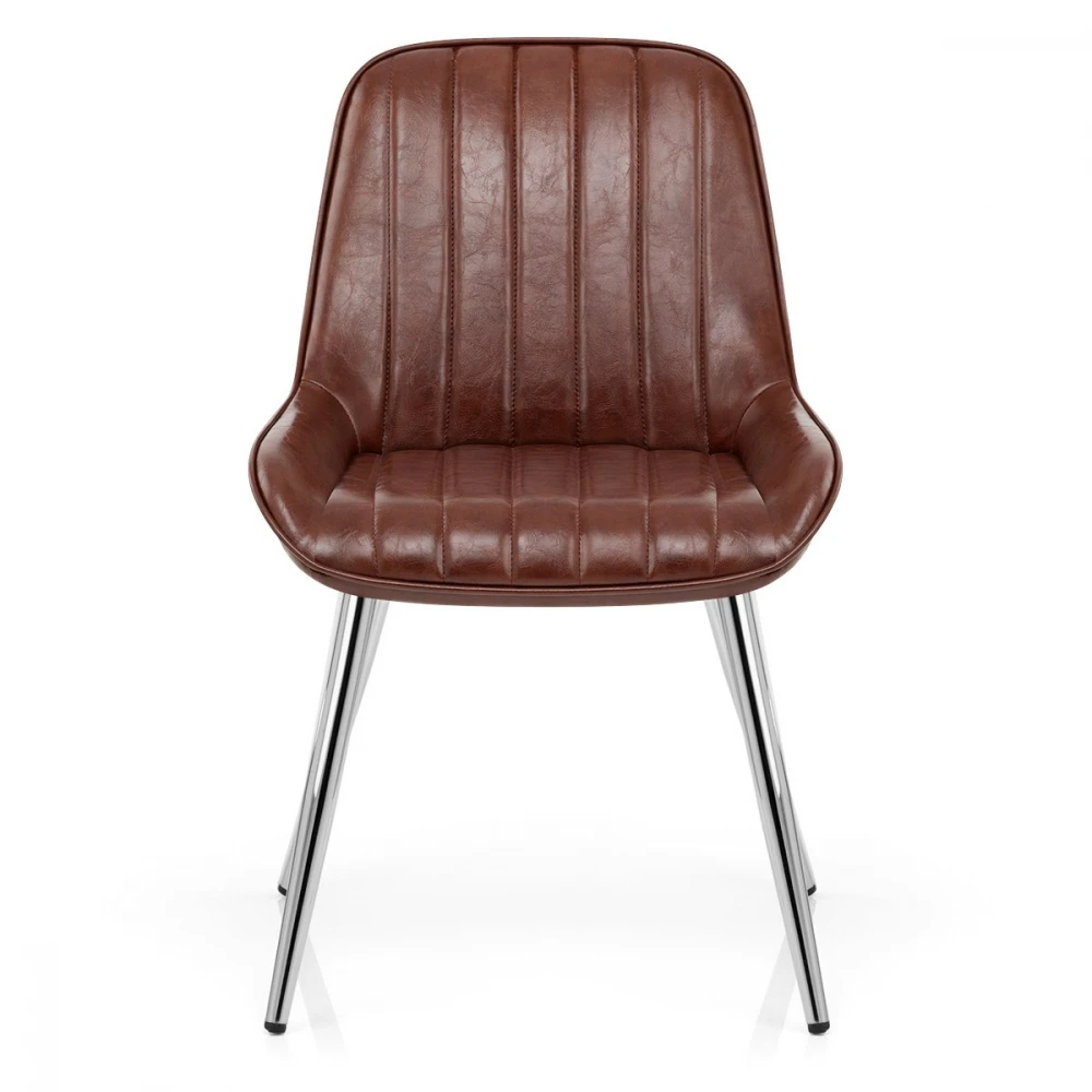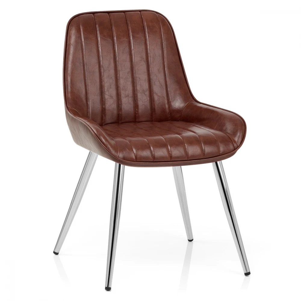 Wenn Sie auf der Suche nach komfortablem Design und modischer Form sind, dann haben Sie im Mustang womöglich etwas gefunden, was Sie vollumfänglich zufriedenstellen könnte. Egal in welchem Raum, dieser Stuhl im Antikdesign setzt immer einen Akzent. Durch den bequemen Antik Kunstleder lässt sich darauf optimal entspannen. Vertikale Elemente verlaufen von der Rückenlehne über die Sitzfläche und verleihen dem Mustang zusätzlich noch ein dynamisches Aussehen. Die hohe Rückenlehne geht perfekt in die Chrom, massiven Beine über und macht den Stuhl in seiner Gesamtheit zu einem ästhetischen Statement. Unter allen Beinen befinden sich Bodenschutzstopfen.