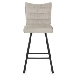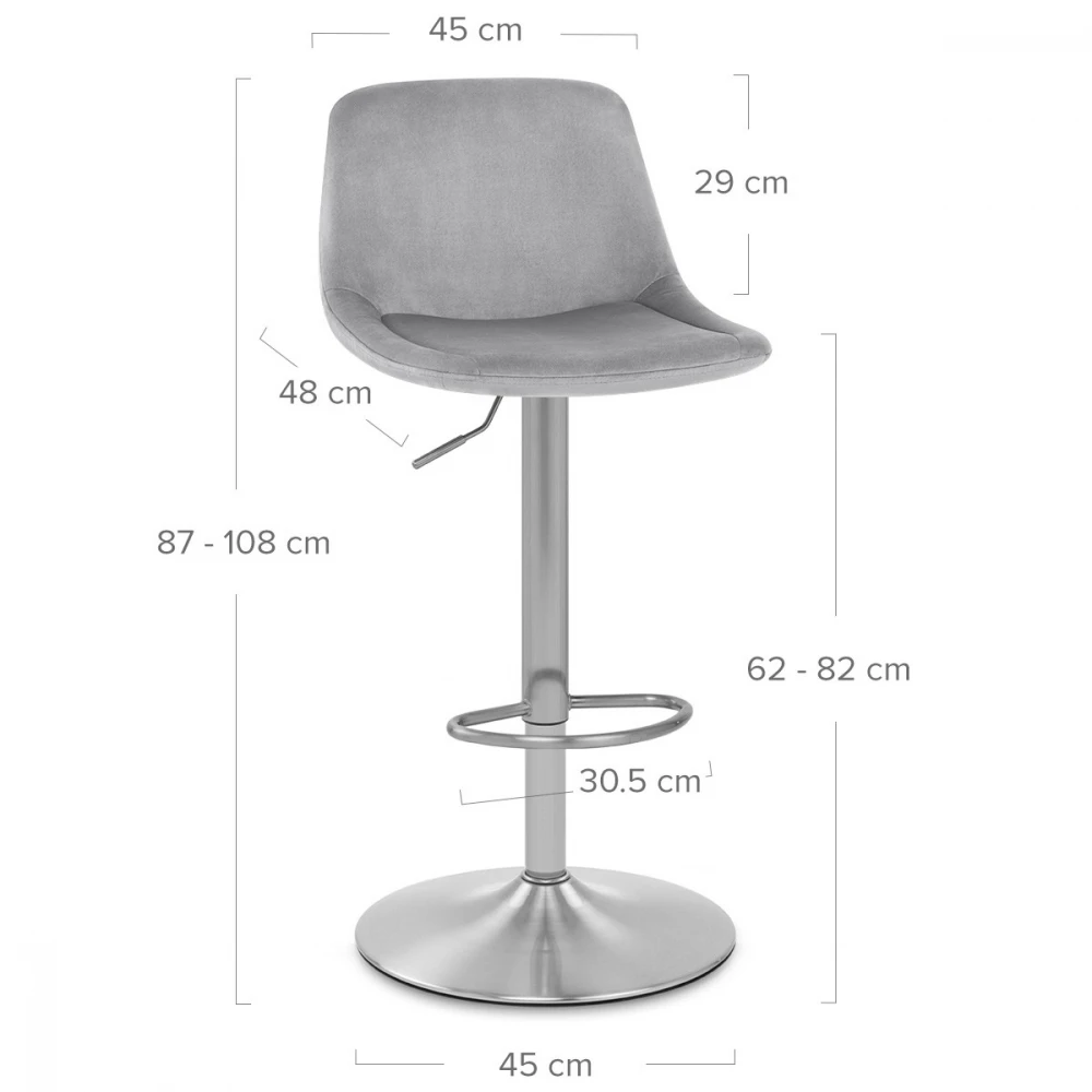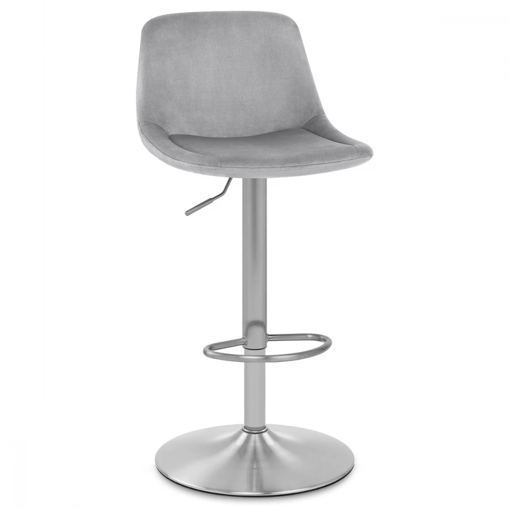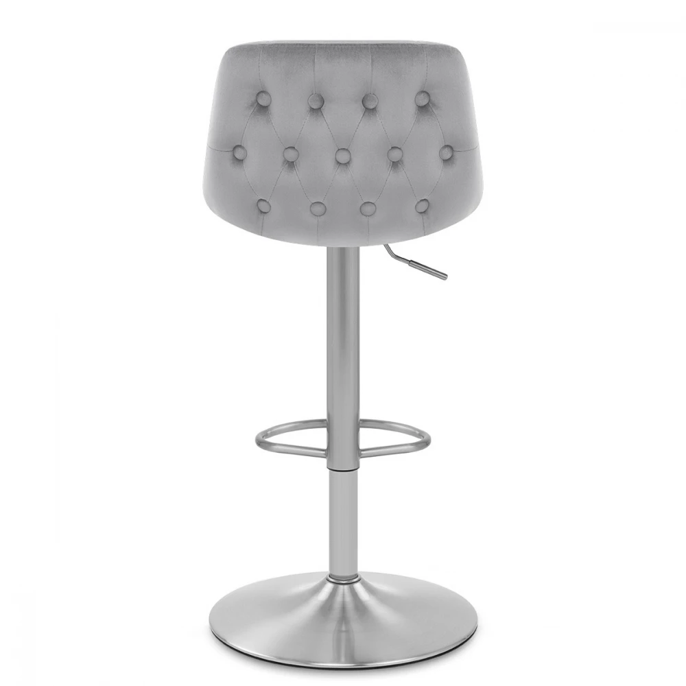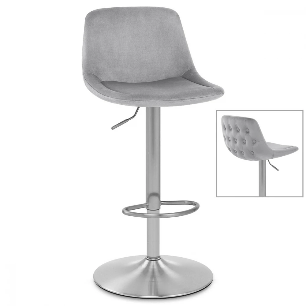 Der Samtbarhocker Scoop ist ein moderner Hocker mit traditionellen Details. Die Samtpolsterung präsentiert eine Raffinesse, die auf der Rückseite der mittelhohen Rückenlehne betont wird. Das geknöpfte Detail konturiert die Rückseite des Sitzes und verleiht dem Hocker die Dekoration, die Ihren Blick auf sich zieht. Eine atemberaubende Säule aus gebürstetem Stahl trägt den Sitz, einschließlich eines Gashebemechanismus. Dies ermöglicht eine variable Höhe und eine 360-Grad-Schwenkbewegung, sodass der Hocker an Ihrer Bar leicht zugänglich ist. Eine passende Fußstütze ist am Rahmen oberhalb der kreisförmigen Basis angebracht. Unter der Basis befindet sich ein Schutzring, um Schäden an Ihren Böden zu vermeiden.