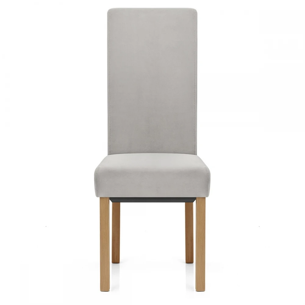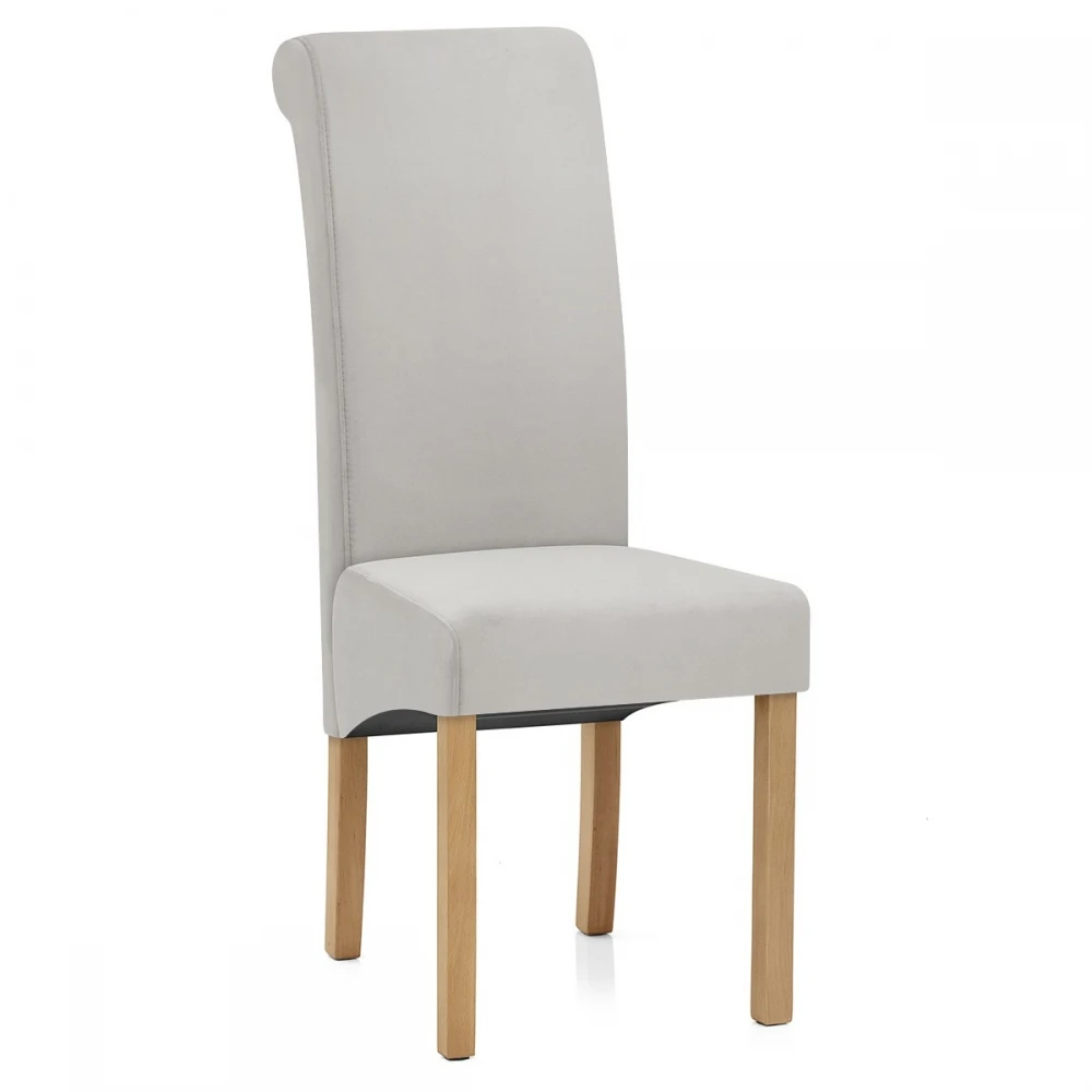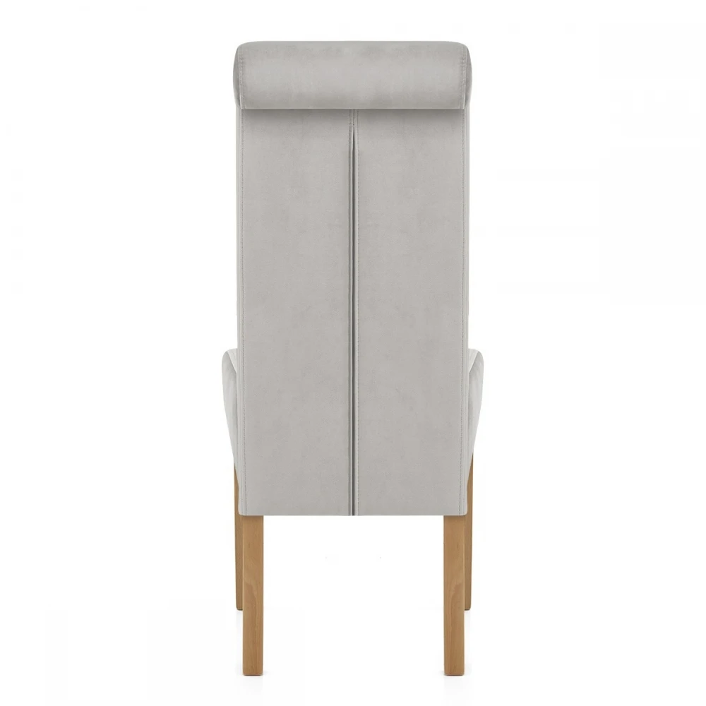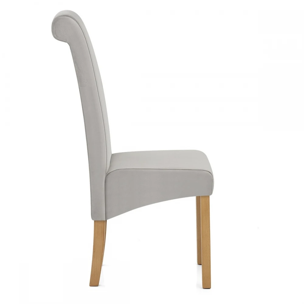 Ein göttliches Design mit traditionellen Eigenschaften. Der bequeme Sitz ist mit wunderschönen grauen Samtbezügen umwickelt und mit einer dichten Polsterung gepolstert. Darüber hinaus verfügt es über eine hohe Rückenlehne mit einem Reißverschluss-Design für einen Hauch von klassischem Stil. Die vier Beine aus massivem Holz unterstützen den Sitz stilvoll und sind mit poliertem Eichen-Finish für eine natürliche Ausstrahlung ausgestattet. Ebenso sind Schutzpolster unter jedem Bein angebracht, um Ihre Böden in gutem Zustand zu halten. Der Carolina Esszimmerstuhl ist eine wunderbare Ergänzung für Ihr Zuhause