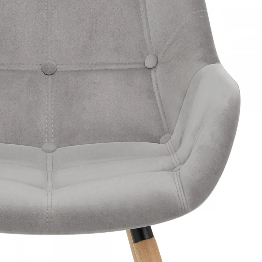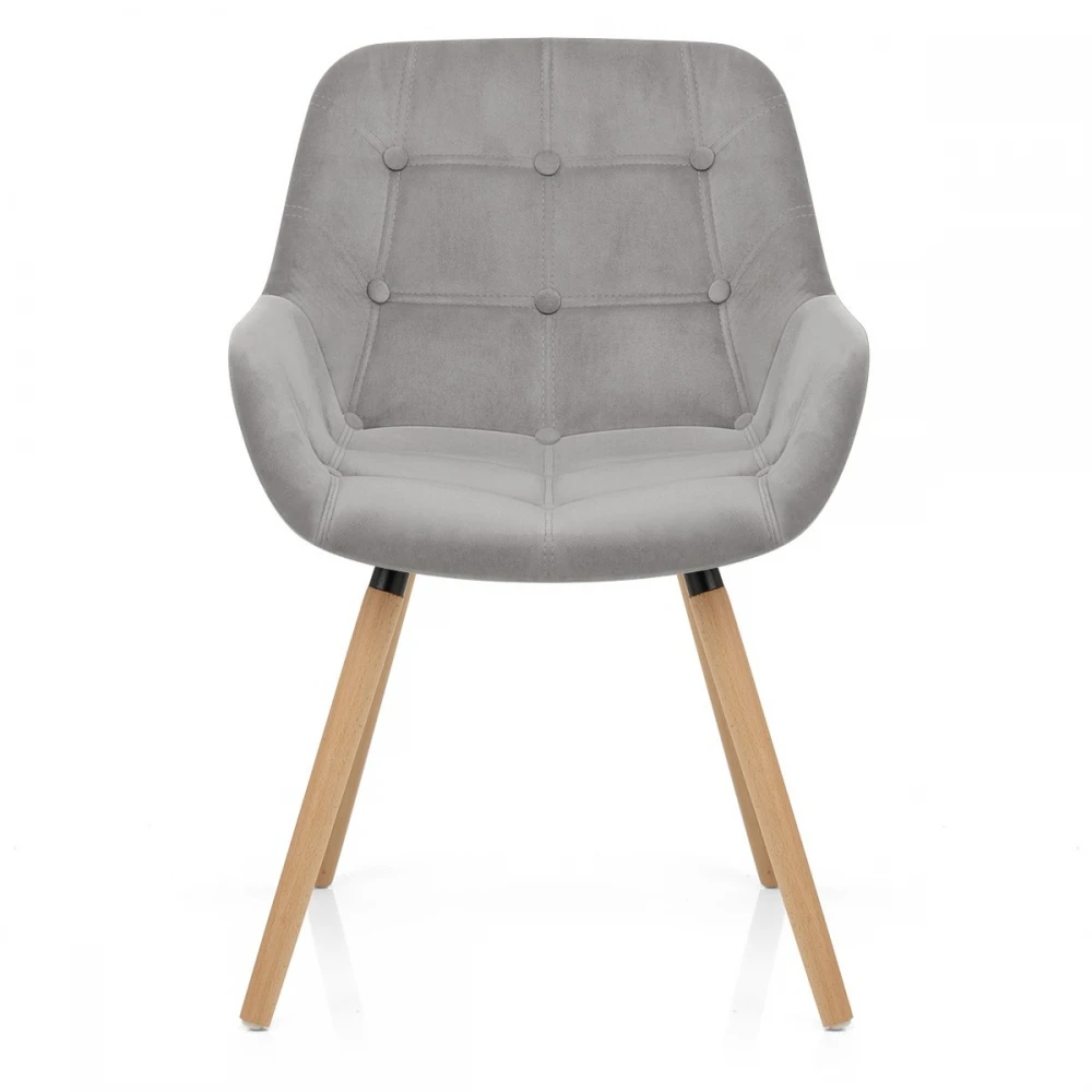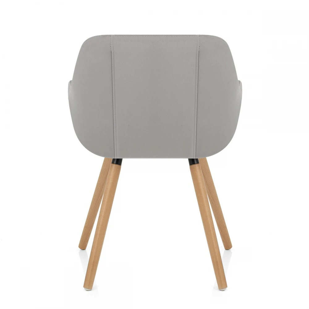 Der Harris Esszimmerstuhl strahlt einen coolen Charakter und Charisma aus und sorgt für ein erfrischendes Retro-Ambiente in Ihrem Esszimmer. Ausgestattet mit unterstützenden Armlehnen können Sie sich auf dem gepolsterten Samtsitz zurücklehnen und entspannen. Darüber hinaus können Sie sicher sein, dass Sie mit grauem Samt, Knöpfen und Stichdetails stilvoll speisen. Vier röhrenförmige Massivholzbeine bilden eine solide Basis für dieses Modell und eine Eichenholzoberfläche sorgt für klassische Eleganz. Außerdem sind schützende Bodenstöpsel enthalten, die zur Pflege Ihrer Oberflächen beitragen.