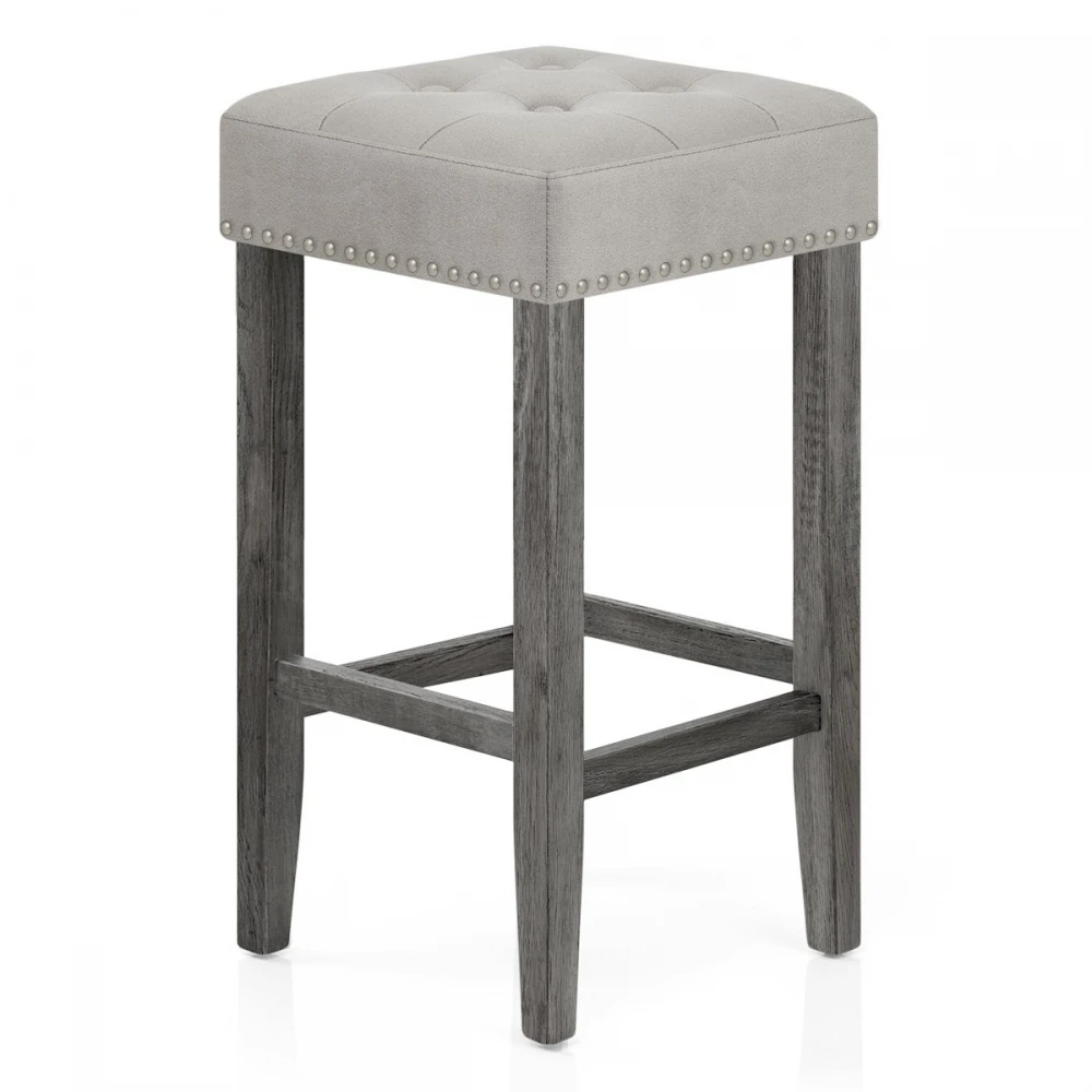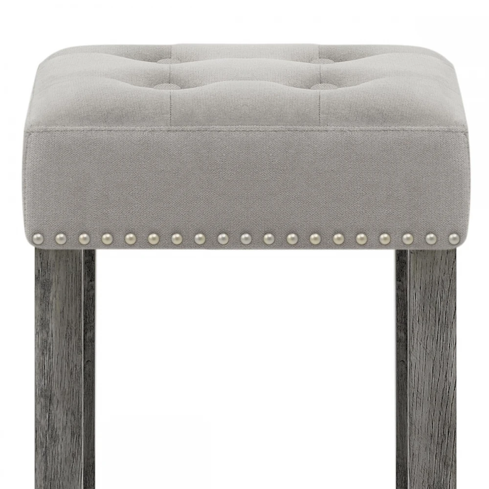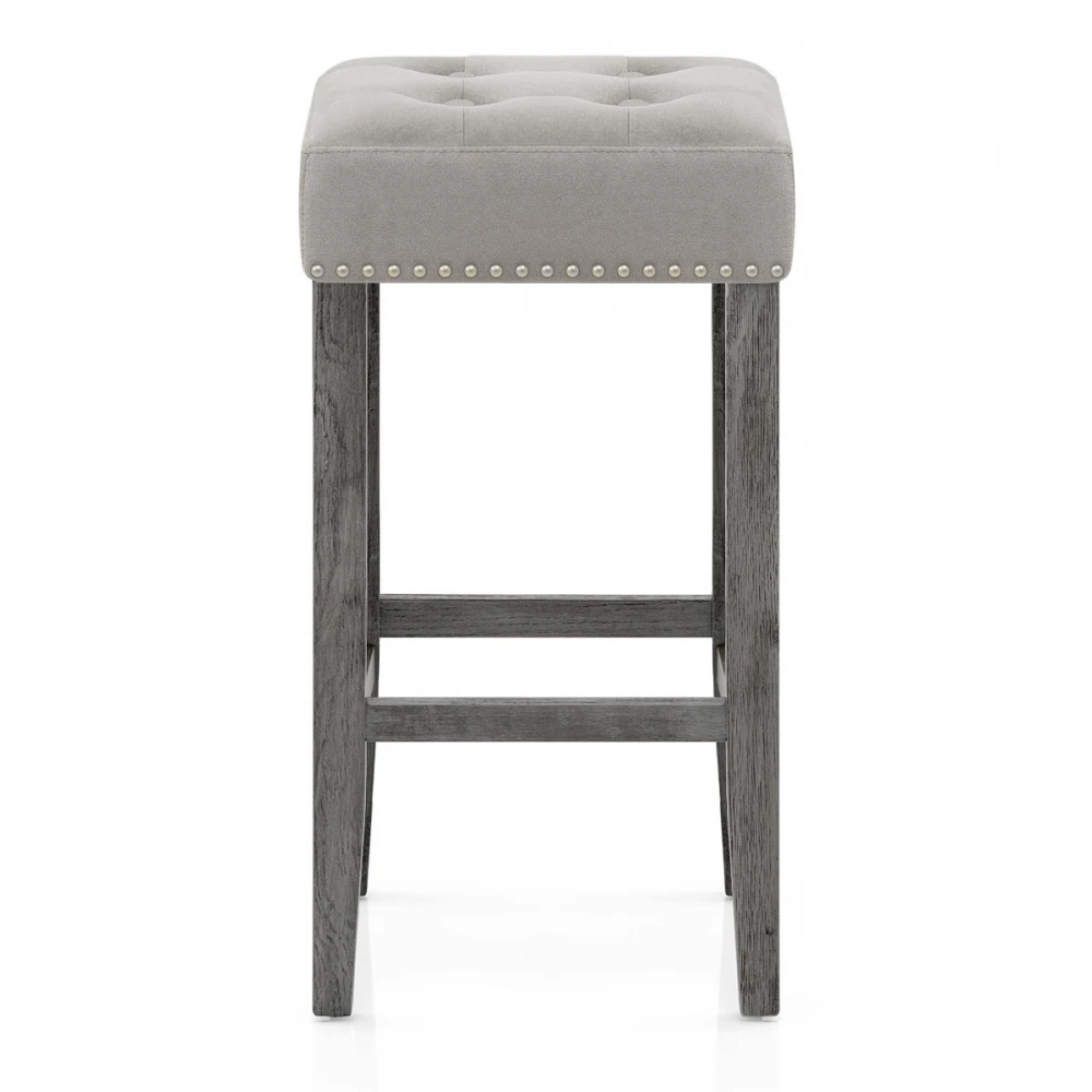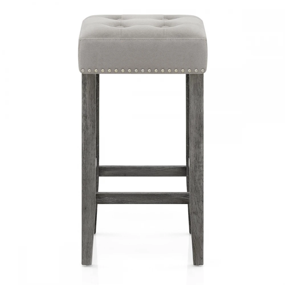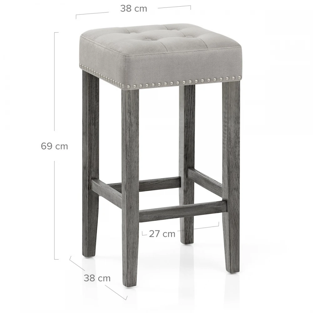 Der Dove Samtbarhocker ist ein reizvolles Design mit fester Höhe und wird Ihren Barbereich elegant ergänzen. In diesem rückenfreien Design vereinen sich Raffinesse und kompaktes Design. Der gepolsterte Sitz aus grauem Samt bietet Knöpfe und Stickereien für Klasse und Schönheit. Darüber hinaus ist der Sitz mit metallischen Nieten eingefasst. Das Gestell aus vier massiven Holzbeinen bildet eine starke Basis für den Hocker und ist mit einem grauen Finish bereichert, das für einen modernen Stil sorgt. Die Füße sind an jeder Seite mit einer Fußstütze ausgestattet. Die mitgelieferten Schutzstopfen sorgen für einen guten Zustand der Böden.
