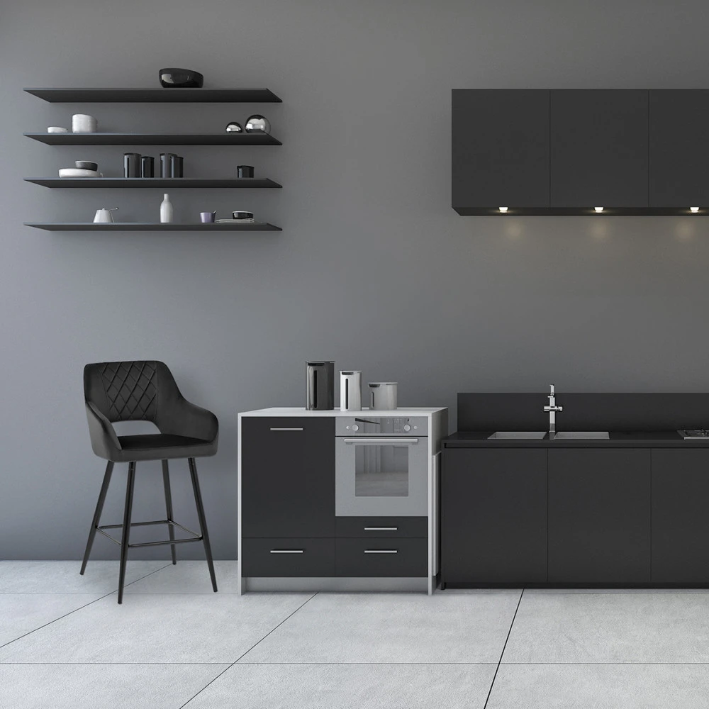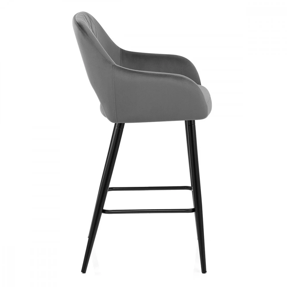 Lehnen Sie sich zurück in einen einladenden, wohlgeformten Sitz und genießen Sie den raffinierten Effekt, den der Lopez durch seine elegante Bauweise bietet. Die dichte Schaumstoffpolsterung ist mit einer weichen, dekadenten Samtschicht überzogen, die den Hocker in seiner Qualität und seinem Komfort noch begehrenswerter macht. Eine stützende Rückenlehne, die durch einen dezenten Spalt und ein abgestepptes Rautenmuster definiert ist, geht in gepolsterte Armlehnen über, die das Sitzpolster umschließen. Eine quadratische, schwarz satinierte Fußstütze unterstreicht den Halt der vier spitz zulaufenden Metallbeine. Das Gestell ist mit konservierenden Bodendübeln ausgestattet, so dass Ihr Boden geschütz wird.