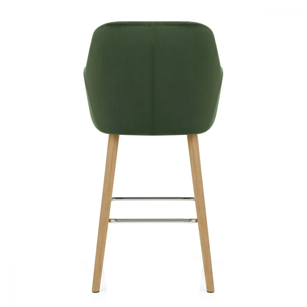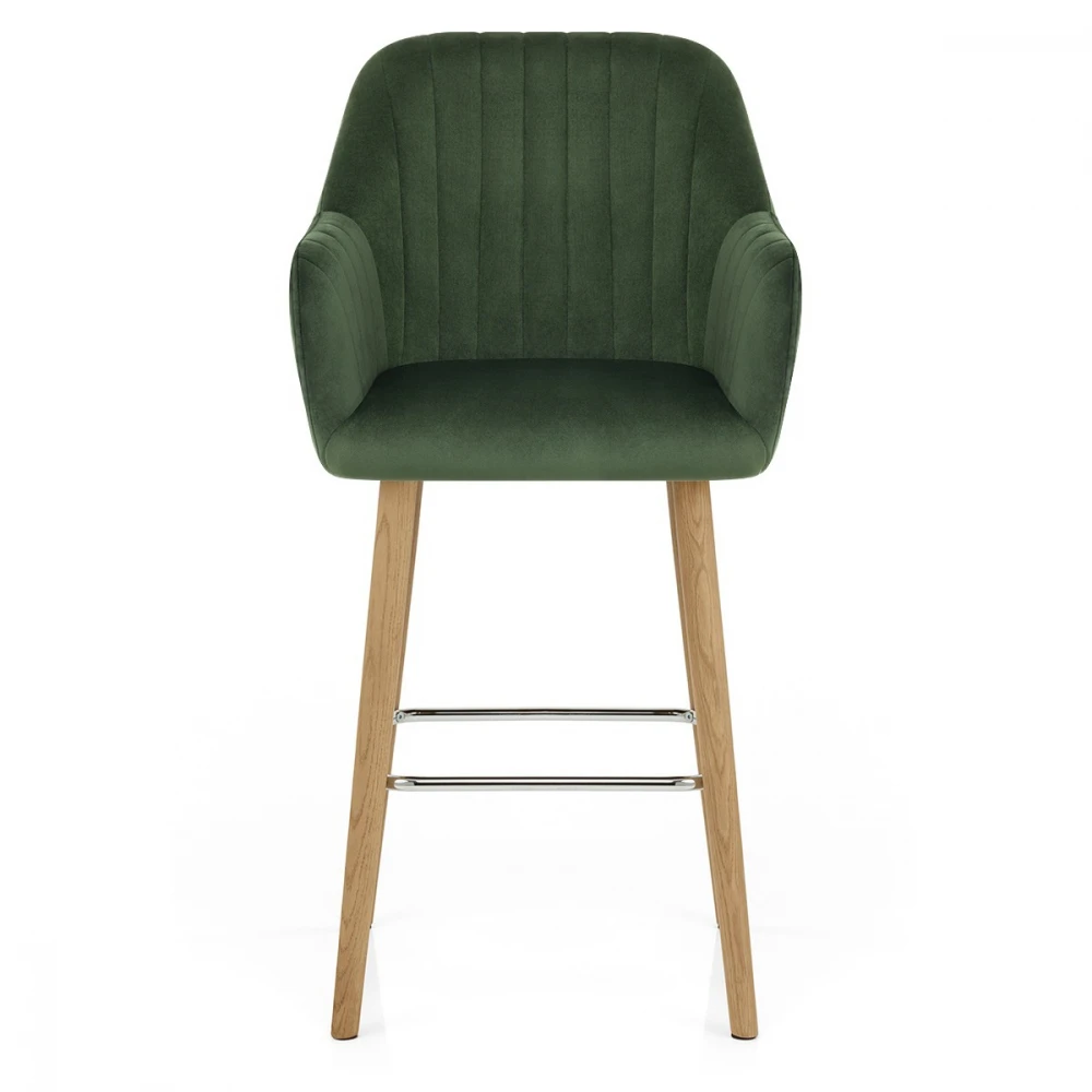 Mit seinen klaren Linien wird der Samtbarhocker Rio einen Hauch Modernität in Ihrem Haus bringen. Die hohe Rückenlehnen ergänzt von den unterstützenden Armlehnen lädt Ihnen zum entspannen ein. Vertikale Nähte betonen die schlichte Sitzfläsche und addieren Charme zum Stuhl. Die vier Beine vom Eichenholz Gestell verfeinern sich in Boden Nähe. Eine verchromte Fuβstütze umringt die Füβe für mehr Komfort im Sitzen. Um Kratzer auf Ihren Böden zu vermeiden, befindet sich unter jedem Bein eine Schutzpolster.