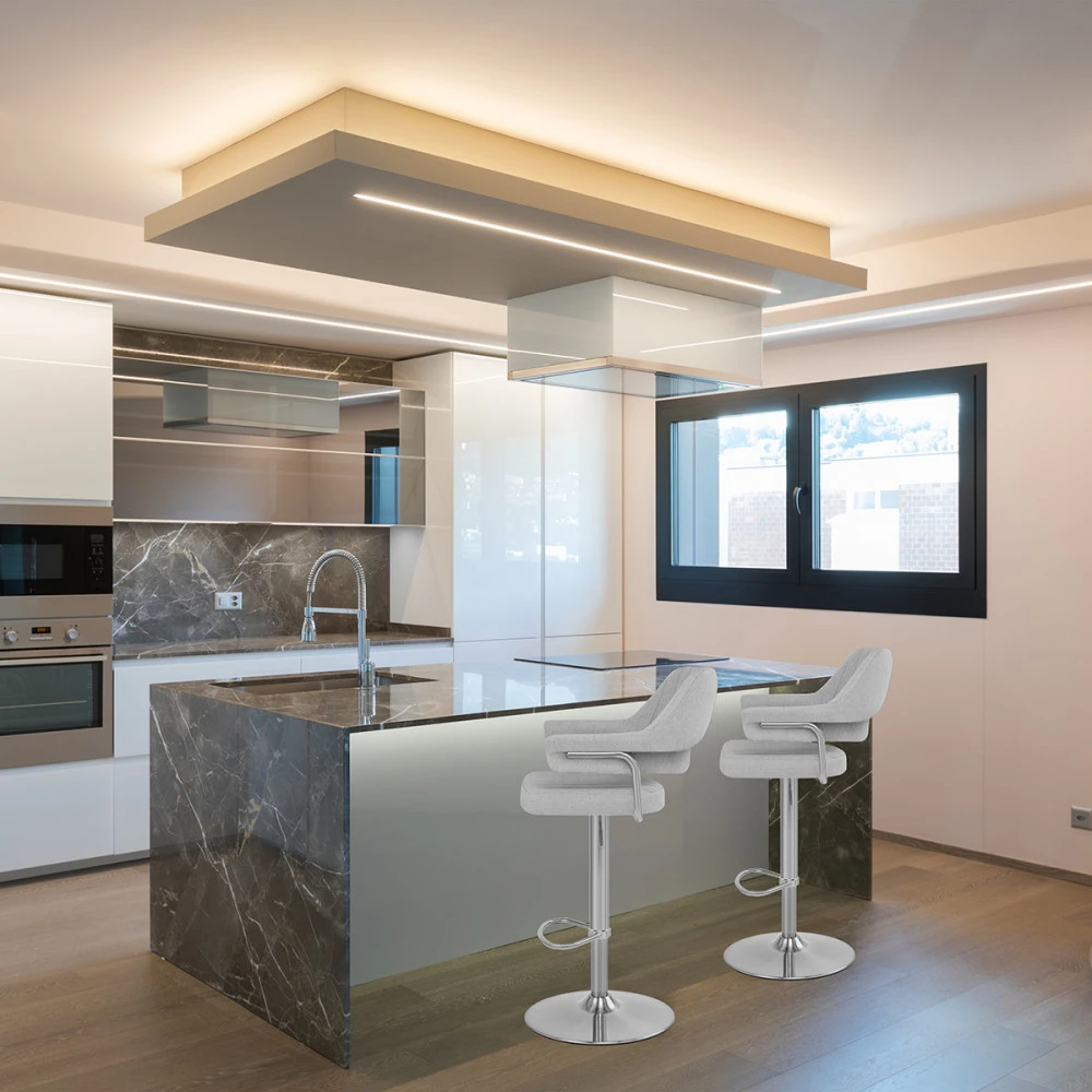 Machen Sie es sich mit dem Stoffbarhocker Gebürstet Skyline bequem. Die Skyline hat das entspannte Design eines Sessels und bringt ihn im Stil eines Barhockers in Ihre Bar. Mit einem Retro-Gefühl gemacht, wird der modische Artikel in Ihrem Zuhause großartig aussehen und wird mit Sicherheit einen Eindruck hinterlassen. Das gepolsterte Design aus weichem Stoff besteht aus einer hohen Rückenlehne und umfassenden Armlehnen, die einen stützenden und bequemen Sitz bieten. Die ergonomische Form lädt Sie ein, sich zu entspannen und das Retro-Feeling des Hockers zu genießen. Dies wird durch das optische Detail der vertikalen Nähte in der Mitte der Rückenlehne und der Oberseite des Sitzpolsters unterstrichen. Der Rahmen der Skyline besteht aus einer Säule aus gebürstetem Stahl mit einem Gasliftmechanismus, der ein Drehen um 360 Grad und eine einstellbare Höhe ermöglicht. Auf dem Rahmen sitzt eine Halbmond-Fußstütze, die dem Skyline ein unverwechselbares Detail verleiht. Um Ihre Böden vor Kratzern und Flecken zu schützen, ist der kreisförmige Boden mit einem Schutzrand versehen.